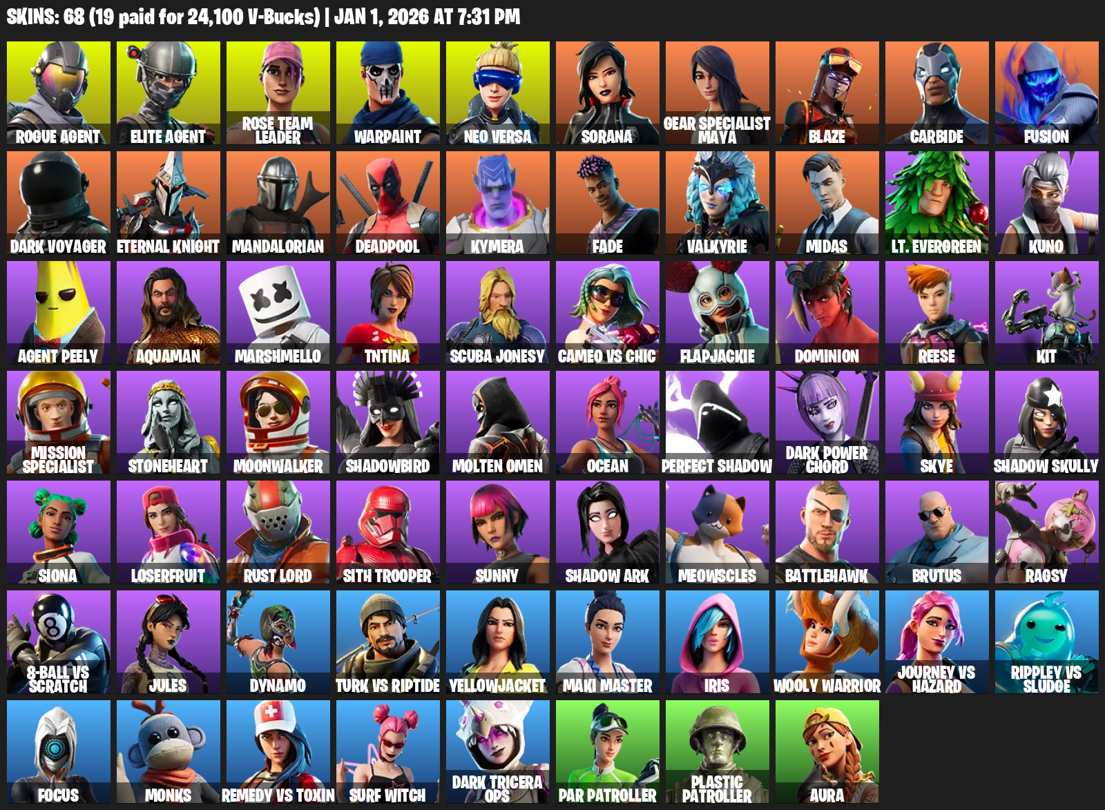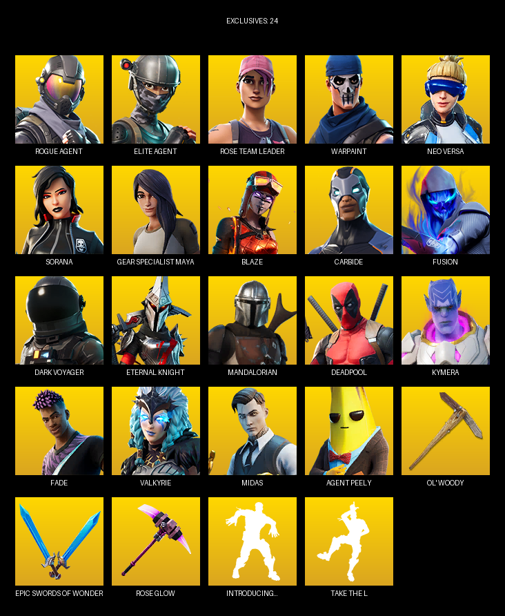 Elite Agent, Gear Specialist Maya, Rose Team Leader, Warpaint, Neo Versa, Sorana, Blaze, Carbide, Fusion, Dark Voyager, Eternal Knight, Mandalorian, Deadpool, Kymera, Fade, Valkyrie, Midas, Lt. Evergreen, Kuno