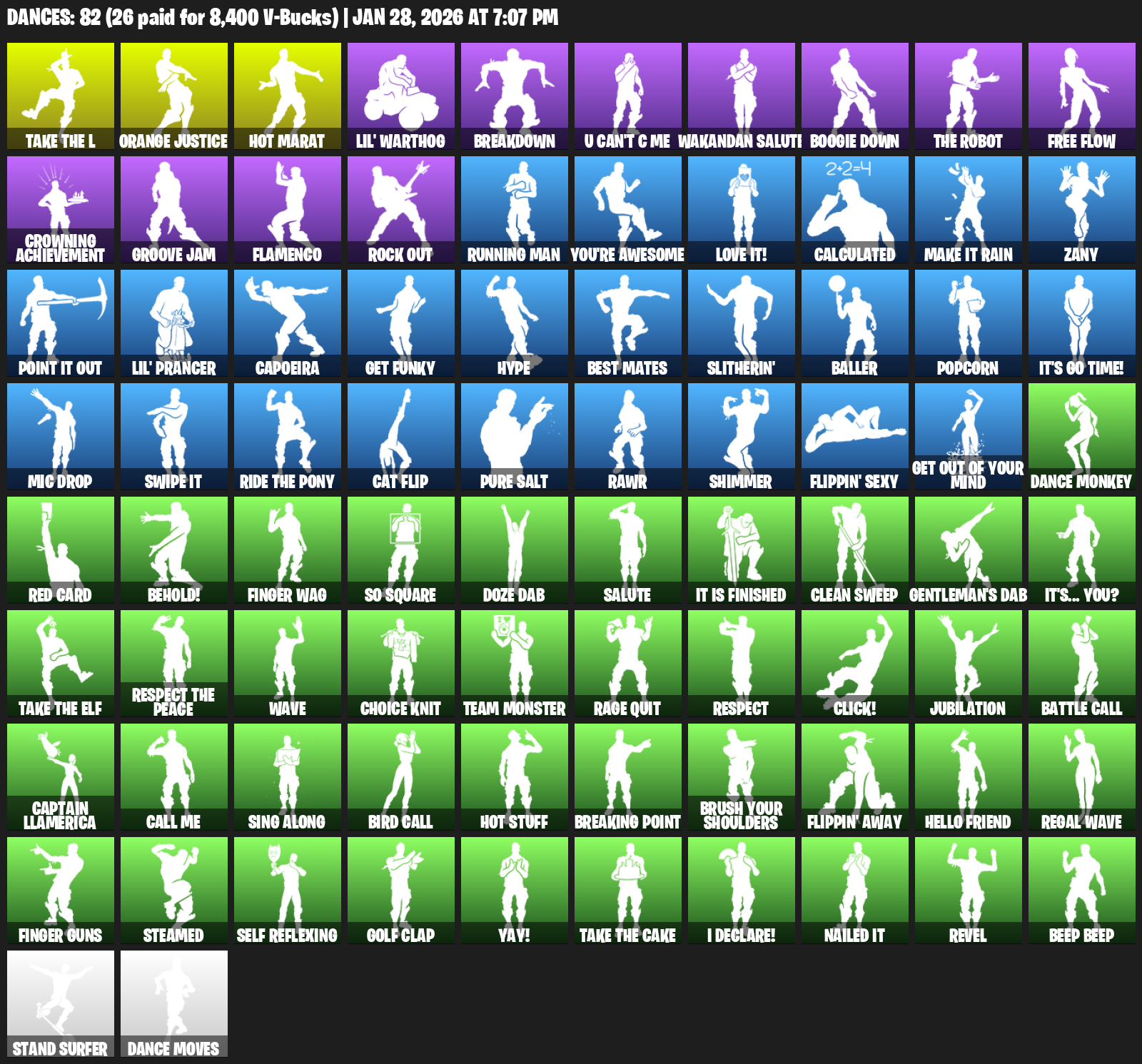 Hot Marat, Orange Justice, Lil’ Warthog, Breakdown, U Can’t C Me, Wakandan Salute, Boogie Down, Free Flow, Crowning Achievement, Groove Jam, Flamenco, Rock Out, Running Man, You’re Awesome, Love it!, Calculated, Make It Rain, Zany