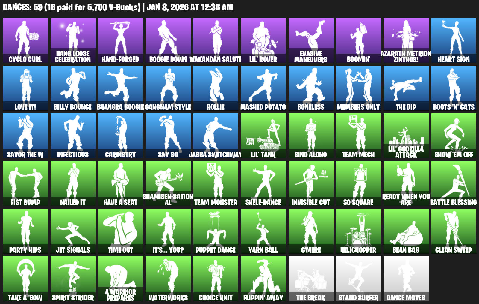 Cyclo Curl, Hang Loose Celebration, Hand-Forged, Boogie Down, Wakandan Salute, Lil’ Rover, Evasive Maneuvers, Boomin’, Azarath Metrion Zinthos!, Heart Sign, Love it!, Billy Bounce, Gangnam Style, Rollie, Mashed Potato, Boneless, Members Only, Boots ‘n’ Cats