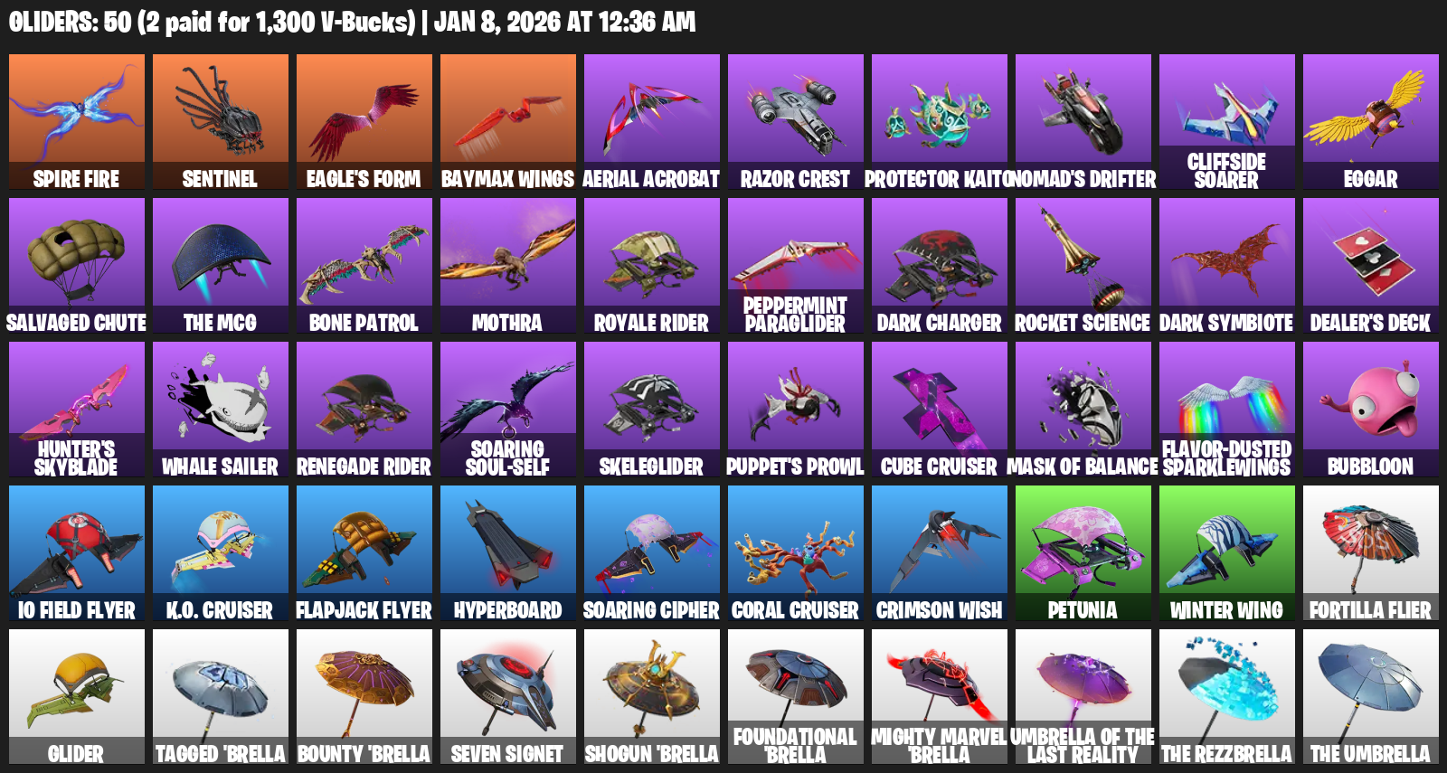 Sentinel, Eagle’s Form, Baymax Wings, Aerial Acrobat, Razor Crest, Protector Kaito, Nomad’s Drifter, Cliffside Soarer, Eggar, Salvaged Chute, Bone Patrol, Mothra, Royale Rider, Peppermint Paraglider, Dark Charger, Rocket Science, Dealer’s Deck