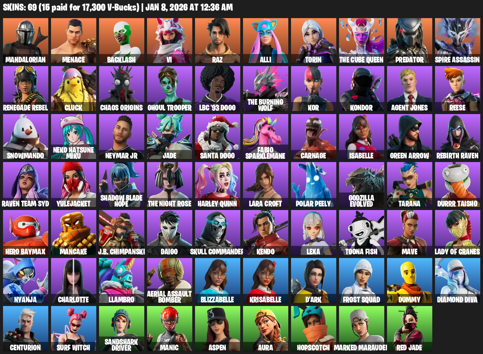 Lara Croft, Mandalorian, Menace, Backlash, Vi, Raz, Alli, Torin, The Cube Queen, Predator, Spire Assassin, Renegade Rebel, Cluck, Chaos Origins, Ghoul Trooper, LBC ’93 Dogg, Kor, Kondor, Agent Jones