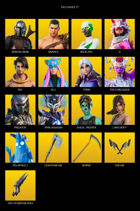 Leviathan Axe, Reaper, Yautja Wristblades, Punchline, Boxing Glove Arrow, Carnage Cleaver, Groot’s Sap Axes, Mutagen Mace, Puffcorn Pick, Jaguar Strike, Torin’s Lightblade, Demonslayer Blade, Harley Hitter, Burning Fangs