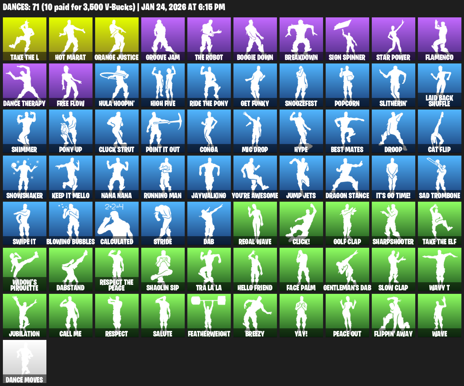 Hot Marat, Orange Justice, Groove Jam, Boogie Down, Breakdown, Sign Spinner, Star Power, Flamenco, Dance Therapy, Free Flow, Hula Hoopin’, High Five, Get Funky, Snoozefest, Popcorn, Slitherin’, Laid Back Shuffle