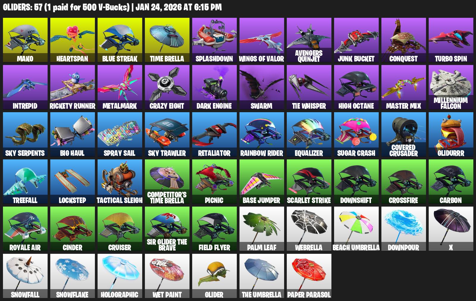 Mako, Heartspan, Time Brella, Splashdown, Avengers Quinjet, Junk Bucket, Conquest, Turbo Spin, Intrepid, Rickety Runner, Metalmark, Crazy Eight, Swarm, TIE Whisper, Master Mix, Millennium Falcon