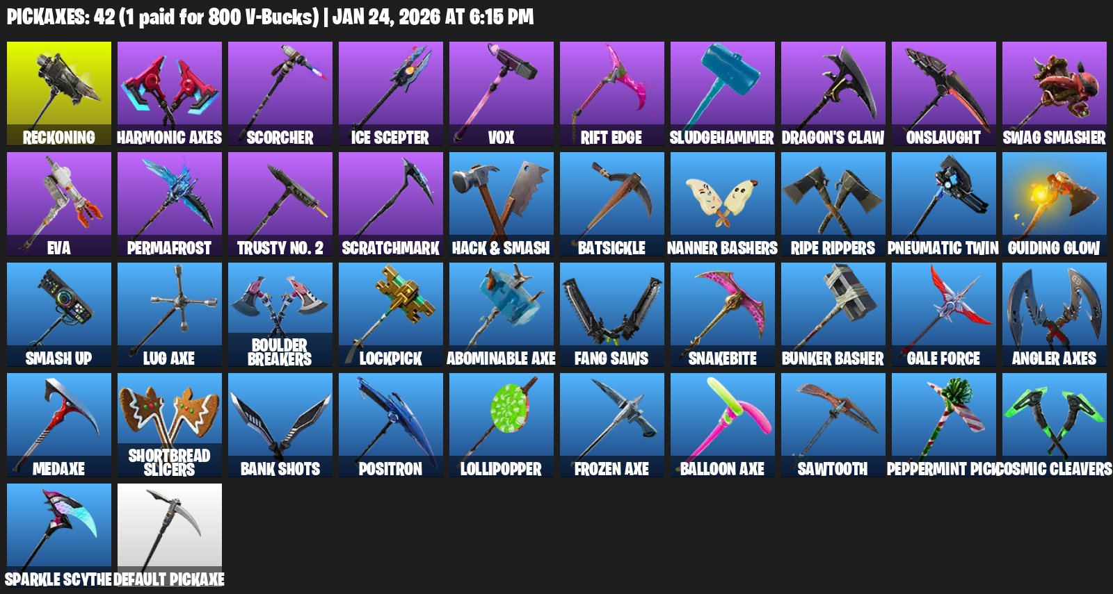 Reckoning, Harmonic Axes, Scorcher, Ice Scepter, Vox, Rift Edge, Sludgehammer, Dragon’s Claw, Onslaught, Swag Smasher, EVA, Permafrost, Trusty No. 2, Scratchmark, Hack & Smash, Batsickle, Nanner Bashers, Ripe Rippers, Pneumatic Twin, Guiding Glow