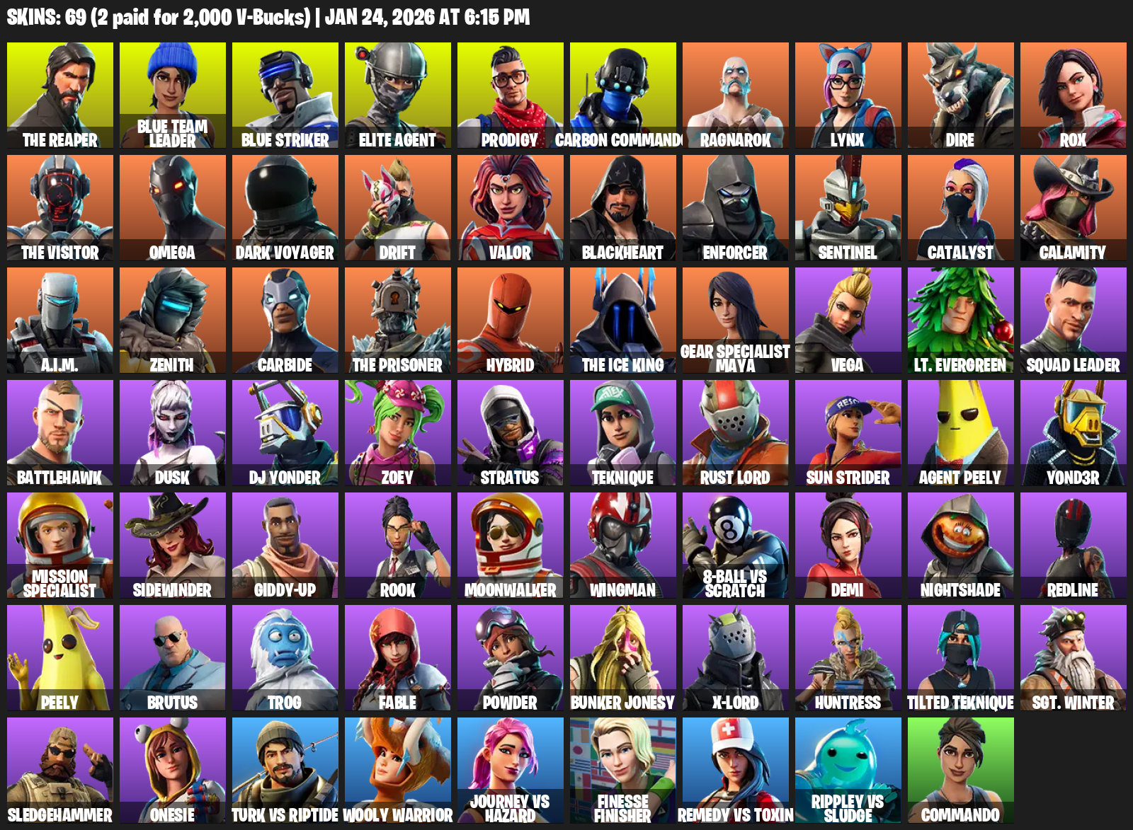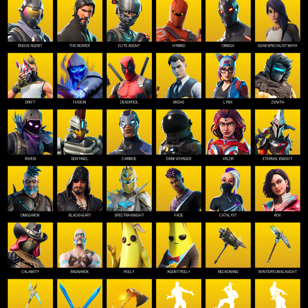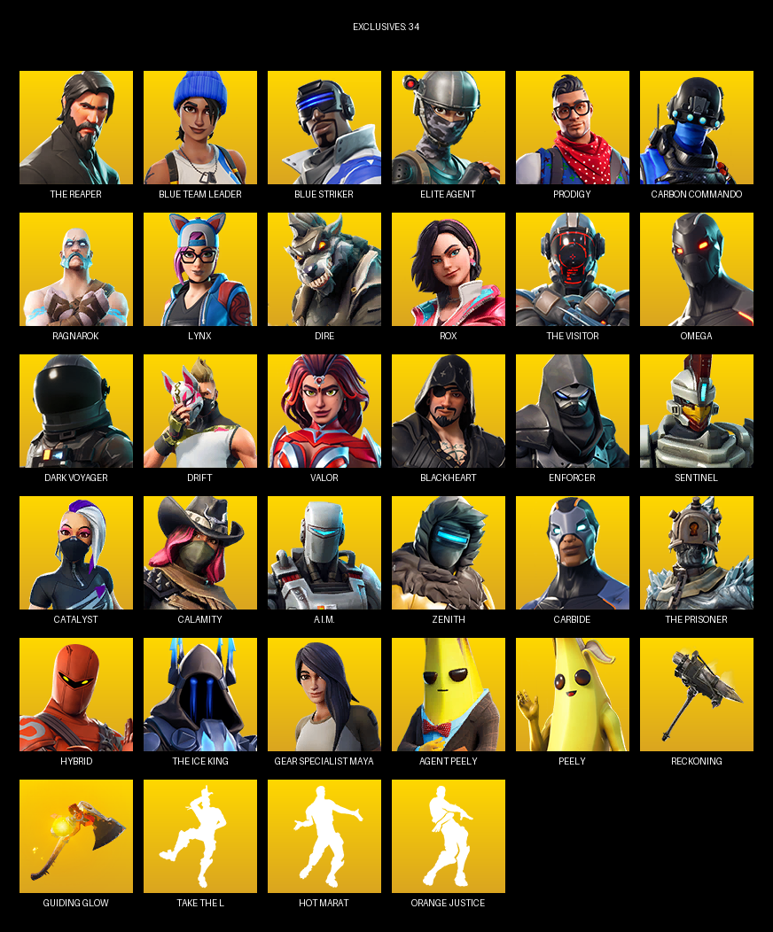 The Reaper, Elite Agent, Omega, Gear Specialist Maya, Blue Team Leader, Prodigy, Carbon Commando, Ragnarok, Lynx, Dire, Rox, Dark Voyager, Drift, Valor, Blackheart, Enforcer, Sentinel, Catalyst
