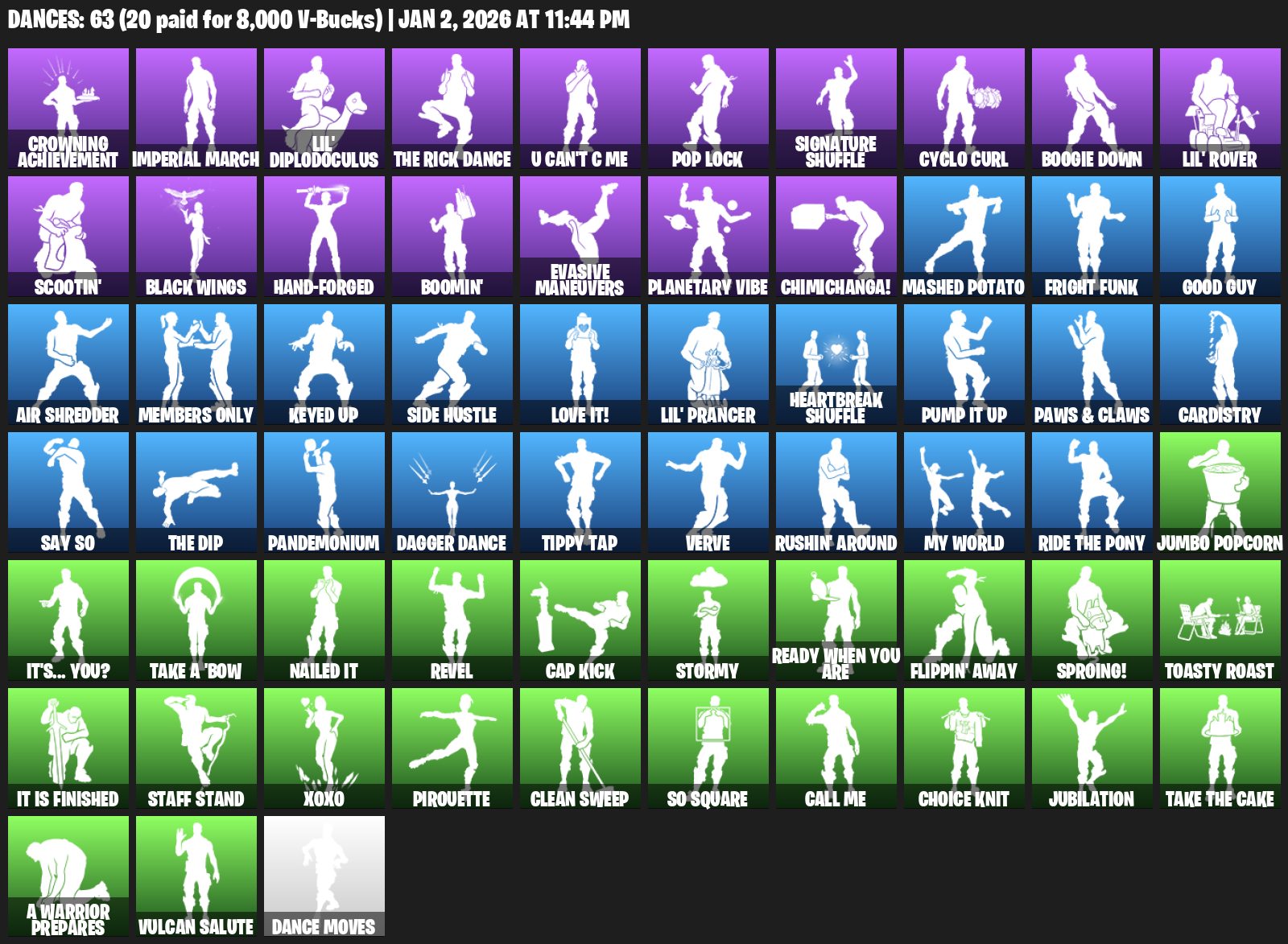 Crowning Achievement, Imperial March, Lil’ Diplodoculus, U Can’t C Me, Pop Lock, Signature Shuffle, Cyclo Curl, Boogie Down, Scootin’, Black Wings, Hand-Forged, Boomin’, Evasive Maneuvers, Planetary Vibe, Chimichanga!, Mashed Potato, Fright Funk, Good Guy