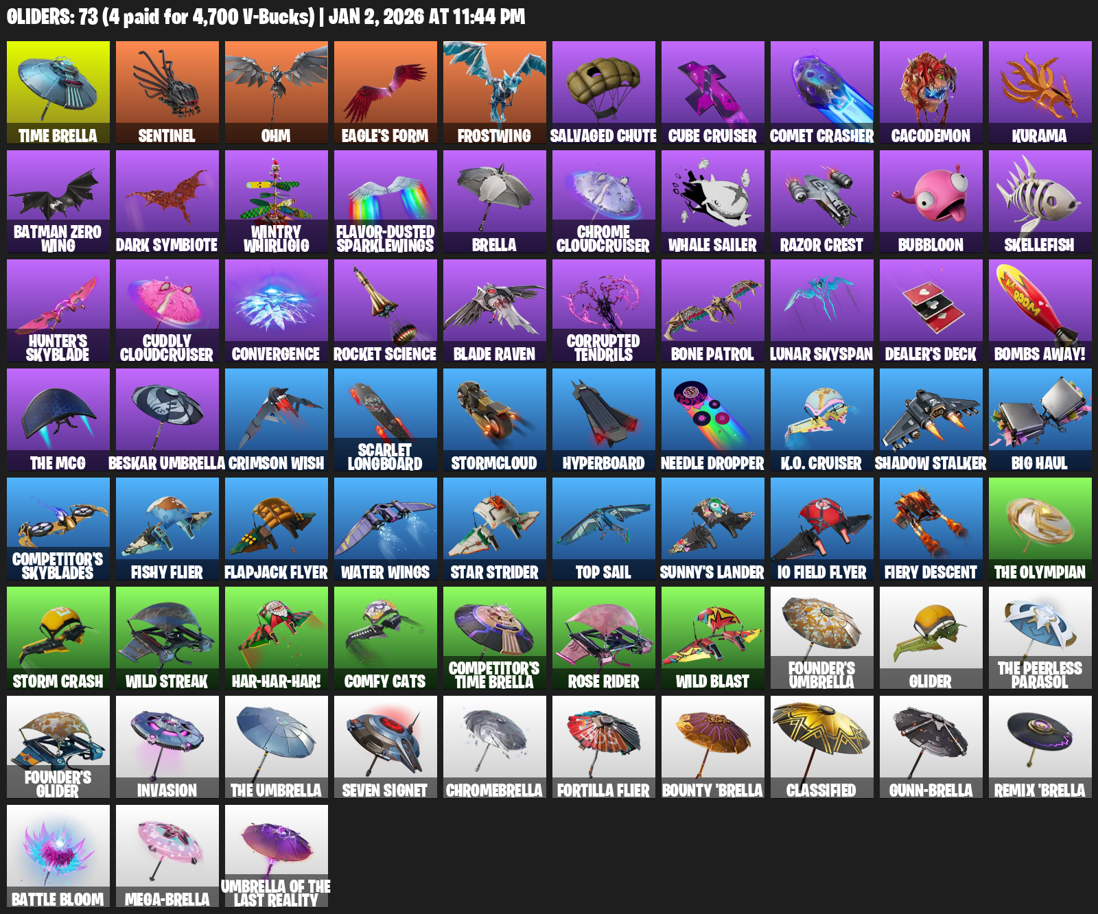 Time Brella, Sentinel, Ohm, Eagle’s Form, Frostwing, Salvaged Chute, Comet Crasher, Cacodemon, Kurama, Batman Zero Wing, Dark Symbiote, Wintry Whirligig, Flavor-Dusted Sparklewings, Chrome Cloudcruiser, Whale Sailer, Razor Crest, Bubbloon, Skellefish