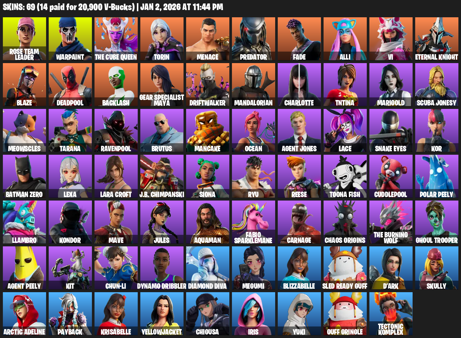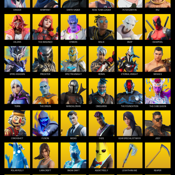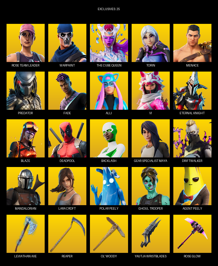 Gear Specialist Maya, Lara Croft, Rose Team Leader, Warpaint, The Cube Queen, Torin, Menace, Predator, Fade, Alli, Vi, Eternal Knight, Blaze, Deadpool, Backlash, Driftwalker, Mandalorian, Charlotte, TNTina, Marigold