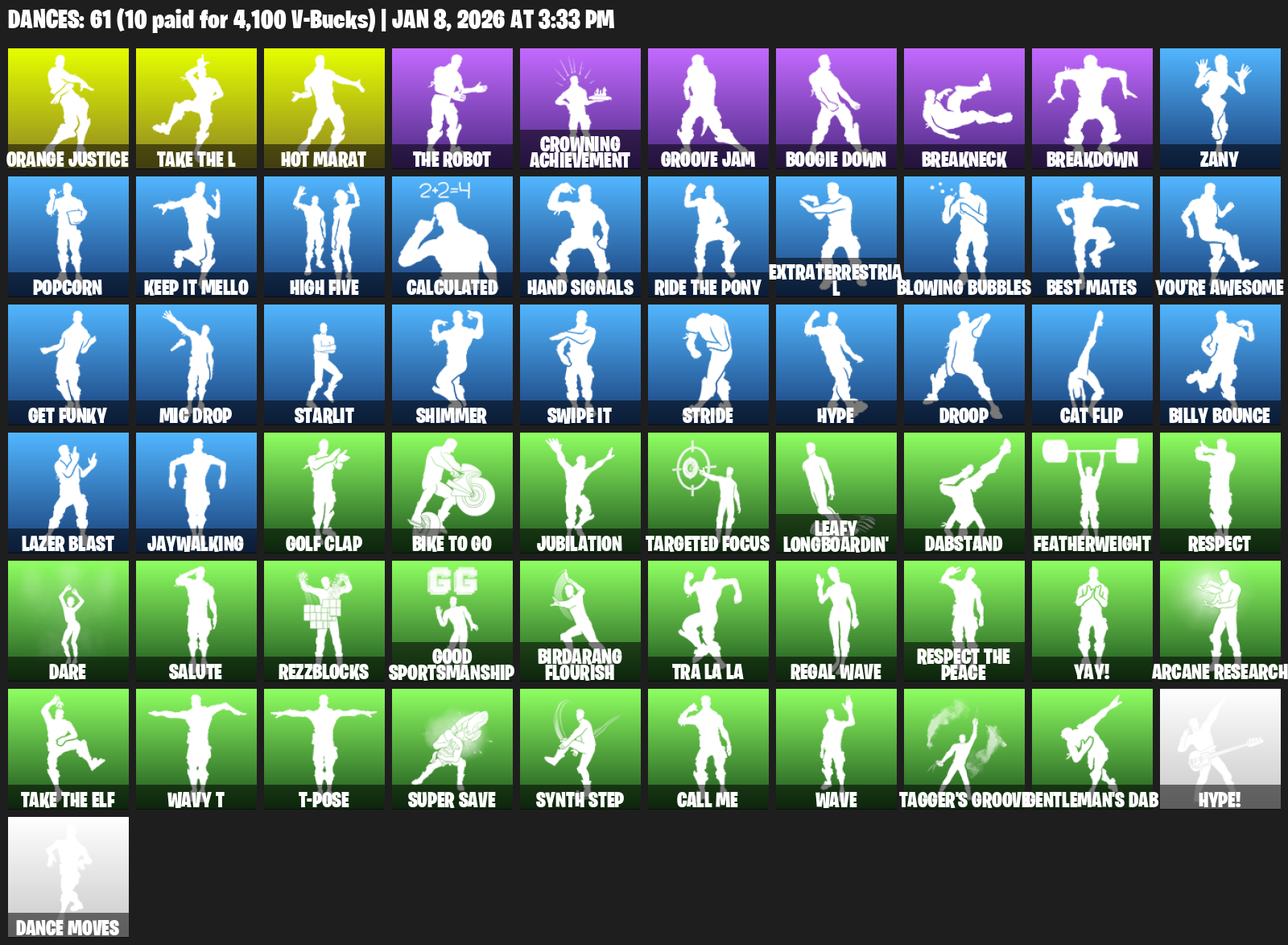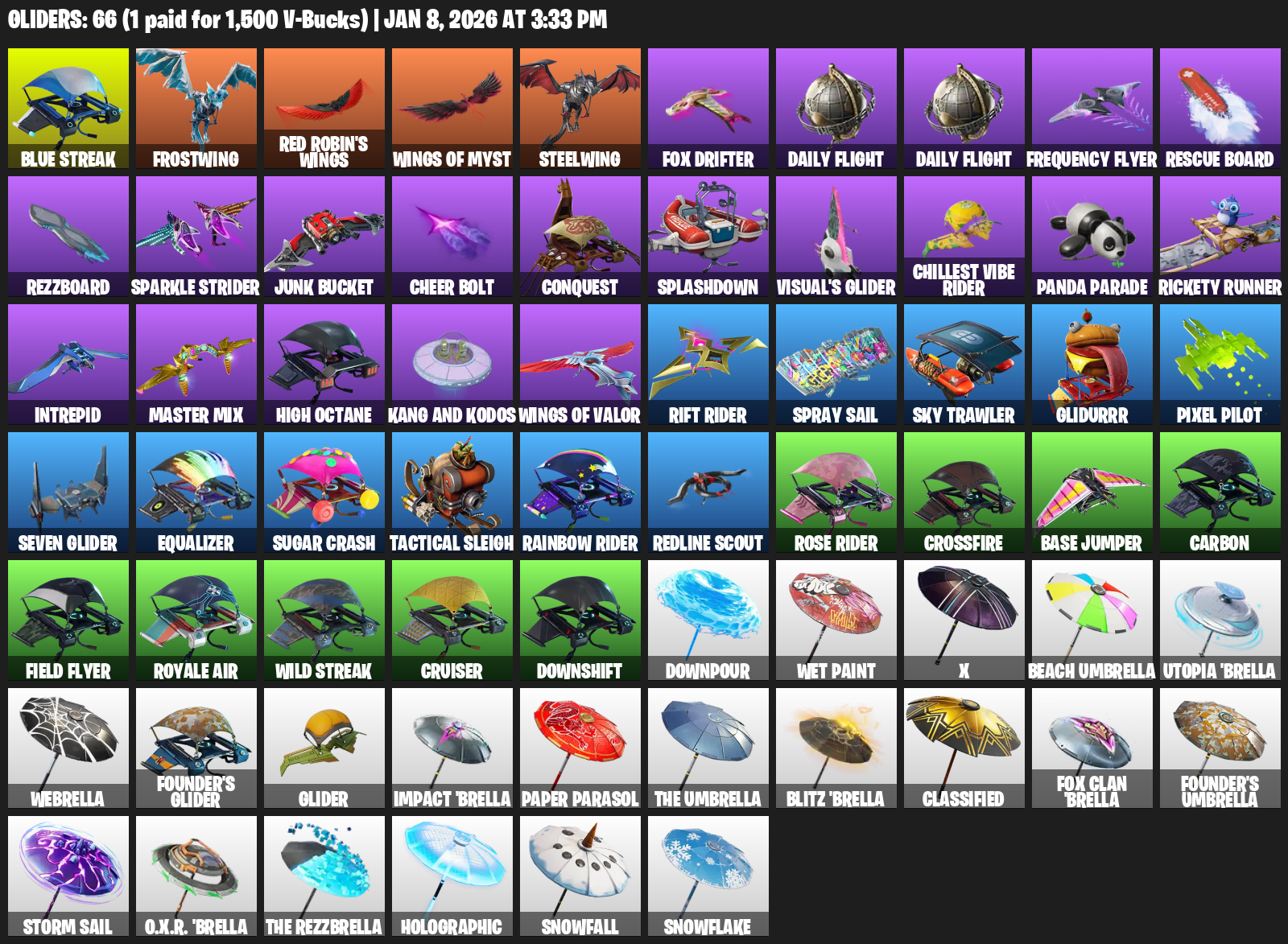 Frostwing, Red Robin’s Wings, Steelwing, Fox Drifter, Daily Flight, Frequency Flyer, Rescue Board, Rezzboard, Junk Bucket, Cheer Bolt, Conquest, Splashdown, Visual’s Glider, Chillest Vibe Rider, Panda Parade, Rickety Runner