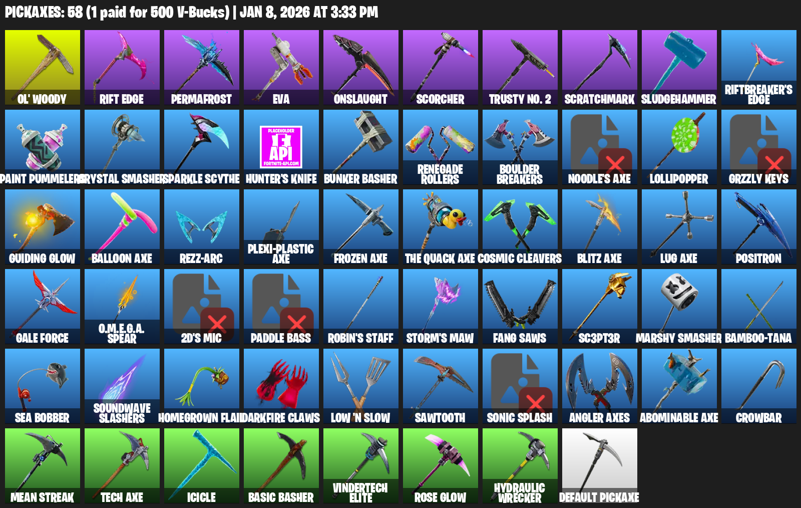 Ol’ Woody, Rift Edge, Permafrost, EVA, Onslaught, Scorcher, Trusty No. 2, Scratchmark, Sludgehammer, Paint Pummelers, Crystal Smasher, Sparkle Scythe, Hunter’s Knife, Bunker Basher, Renegade Rollers, Boulder Breakers, Noodle’s Axe, Lollipopper, Grzzly Keys