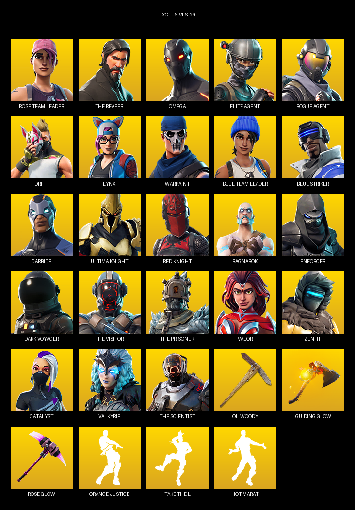 The Reaper, Omega, Elite Agent, Rose Team Leader, Drift, Lynx, Warpaint, Blue Striker, Carbide, Ultima Knight, Ragnarok, Enforcer, Dark Voyager, Valor, Zenith