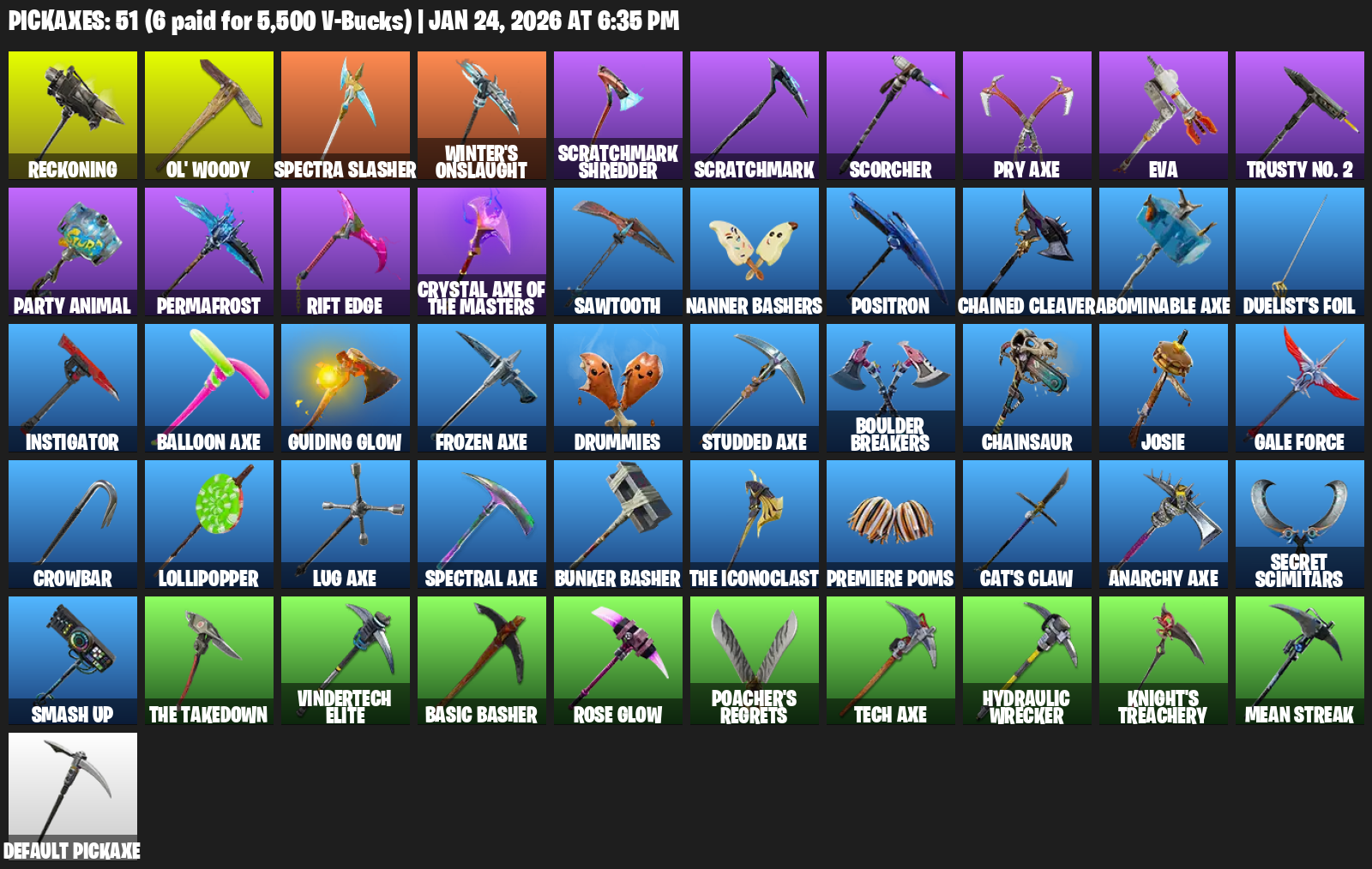 Reckoning, Ol’ Woody, Winter’s Onslaught, Scratchmark Shredder, Scorcher, Pry Axe, EVA, Trusty No. 2, Party Animal, Permafrost, Rift Edge, Sawtooth, Nanner Bashers, Positron, Chained Cleaver, Duelist’s Foil