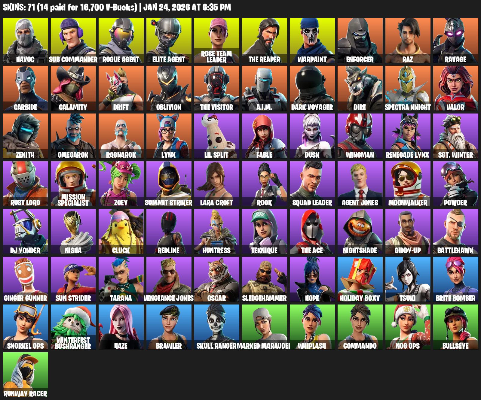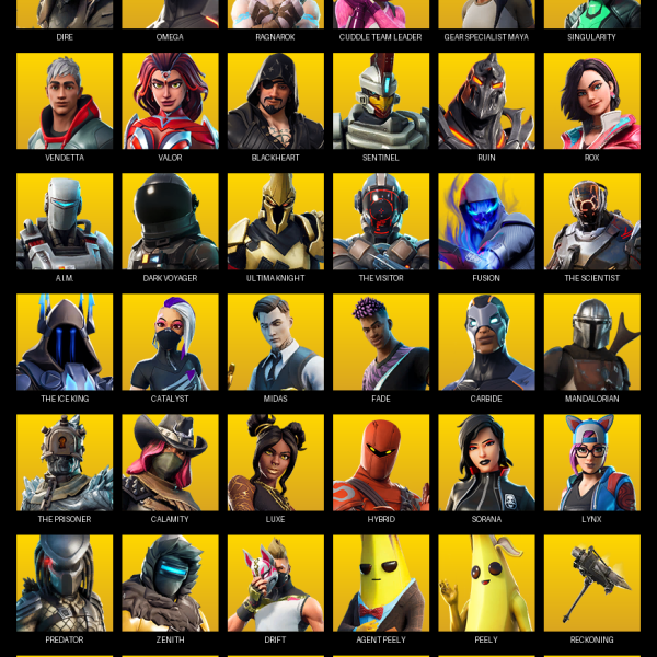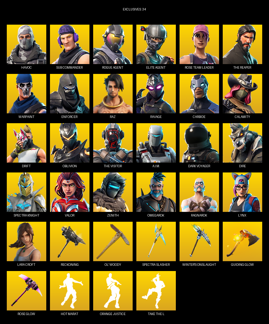 Elite Agent, The Reaper, Lara Croft, Havoc, Sub Commander, Rose Team Leader, Warpaint, Enforcer, Raz, Ravage, Carbide, Calamity, Drift, Oblivion, A.I.M., Dark Voyager, Dire, Spectra Knight