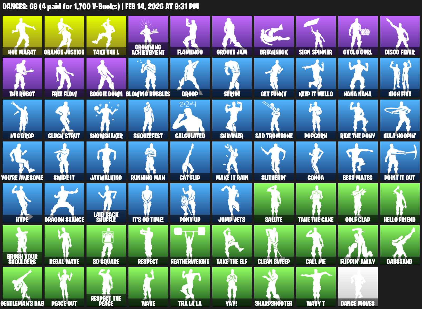 Hot Marat, Orange Justice, Crowning Achievement, Flamenco, Groove Jam, Breakneck, Sign Spinner, Cyclo Curl, Disco Fever, Free Flow, Boogie Down, Blowing Bubbles, Droop, Stride, Get Funky, Keep It Mello, Nana Nana, High Five