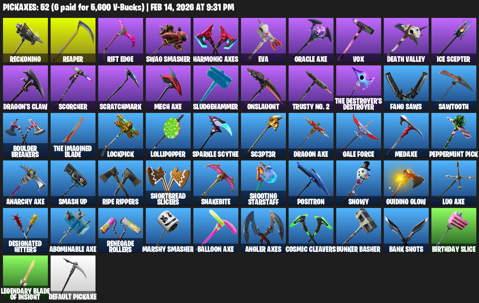 Reckoning, Rift Edge, Swag Smasher, Harmonic Axes, EVA, Oracle Axe, Vox, Death Valley, Ice Scepter, Dragon’s Claw, Scorcher, Scratchmark, Sludgehammer, Onslaught, Trusty No. 2, Fang Saws, Sawtooth
