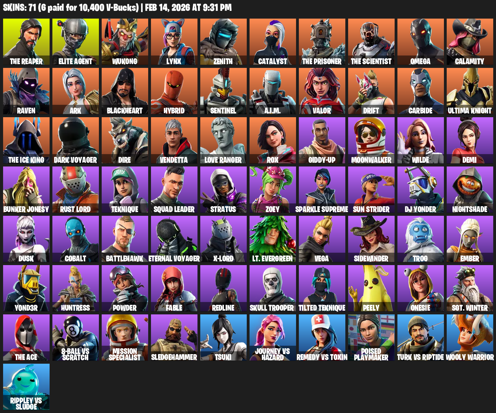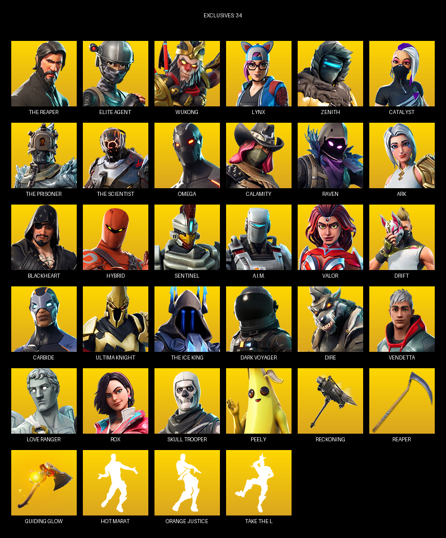 The Reaper, Elite Agent, Omega, Wukong, Lynx, Zenith, Catalyst, Calamity, Raven, Ark, Blackheart, Hybrid, Sentinel, A.I.M., Valor, Drift, Carbide, Ultima Knight