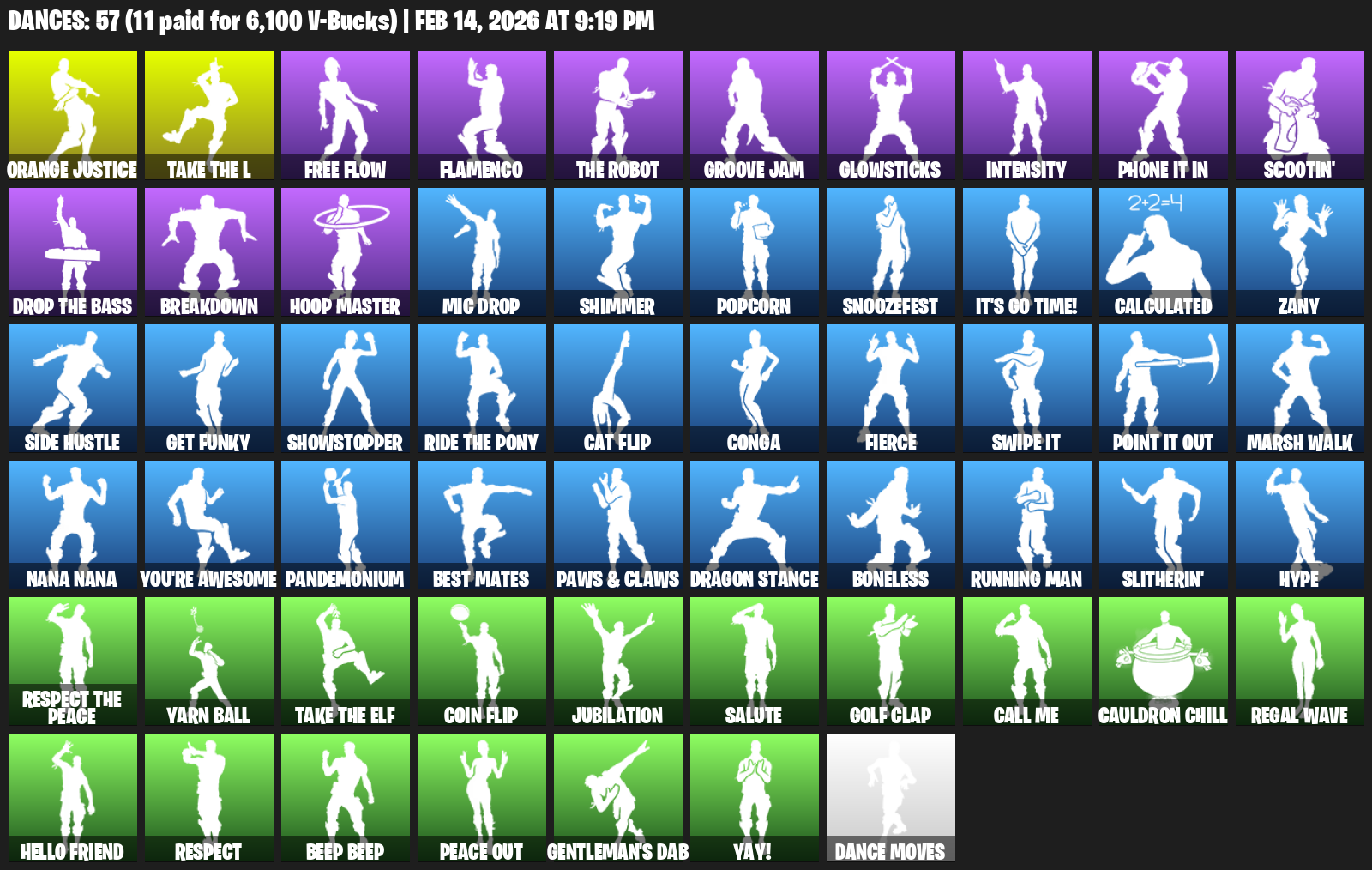 Orange Justice, Free Flow, Flamenco, Groove Jam, Glowsticks, Intensity, Phone It In, Scootin’, Breakdown, Hoop Master, Mic Drop, Shimmer, Popcorn, Snoozefest, It’s Go Time!, Calculated, Zany