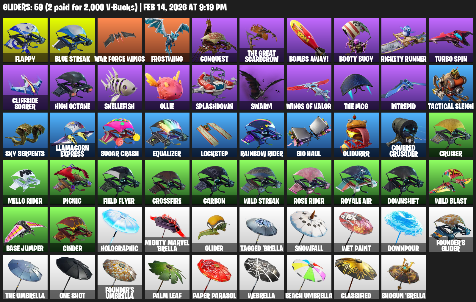 Flappy, Blue Streak, War Force Wings, Frostwing, Conquest, Bombs Away!, Booty Buoy, Rickety Runner, Turbo Spin, Cliffside Soarer, High Octane, Skellefish, Ollie, Splashdown, Swarm, Intrepid, Tactical Sleigh
