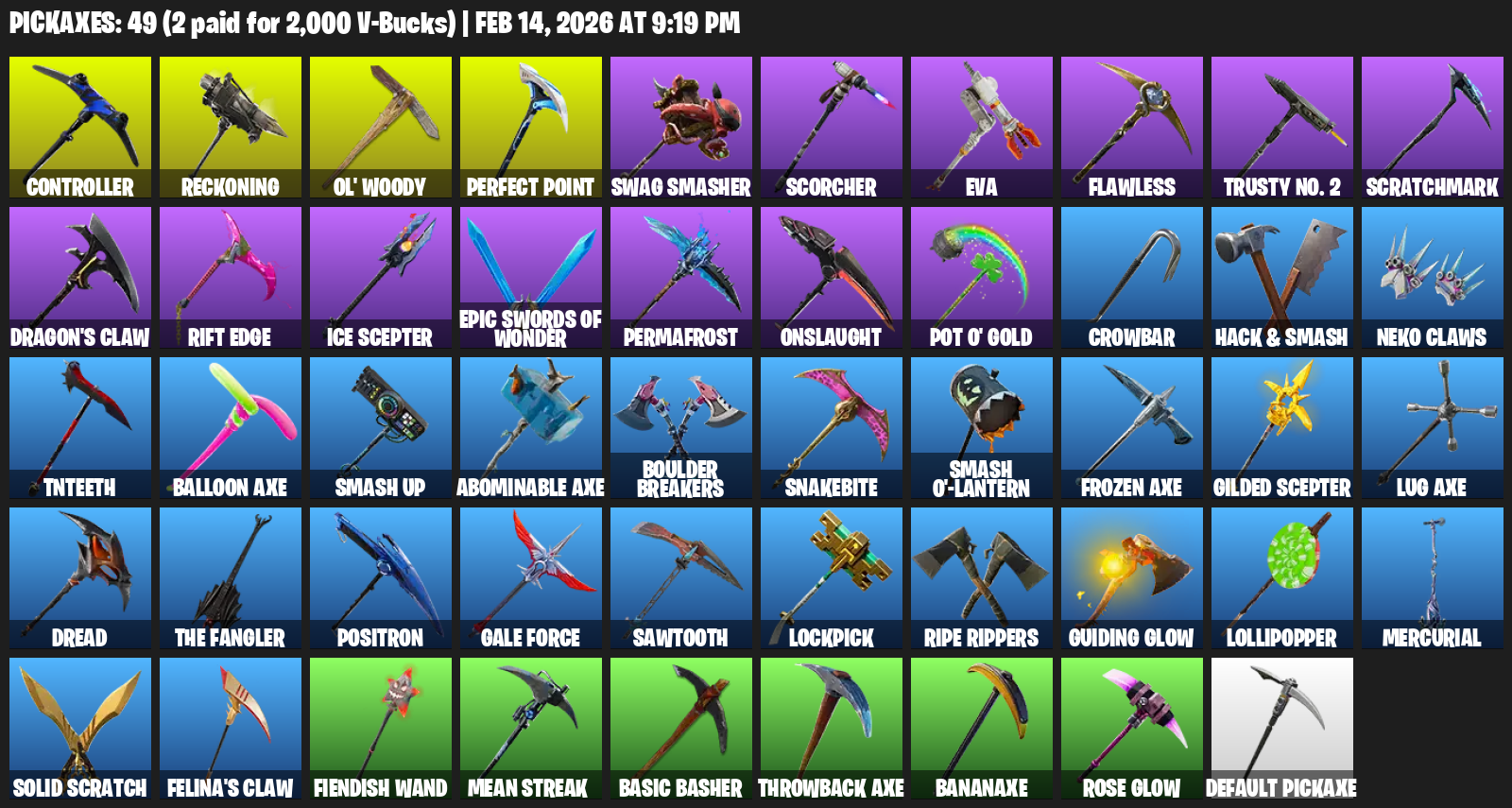 Controller, Reckoning, Ol’ Woody, Perfect Point, Swag Smasher, Scorcher, EVA, Flawless, Trusty No. 2, Scratchmark, Dragon’s Claw, Rift Edge, Ice Scepter, Permafrost, Onslaught, Pot O’ Gold, Crowbar, Hack & Smash, Neko Claws