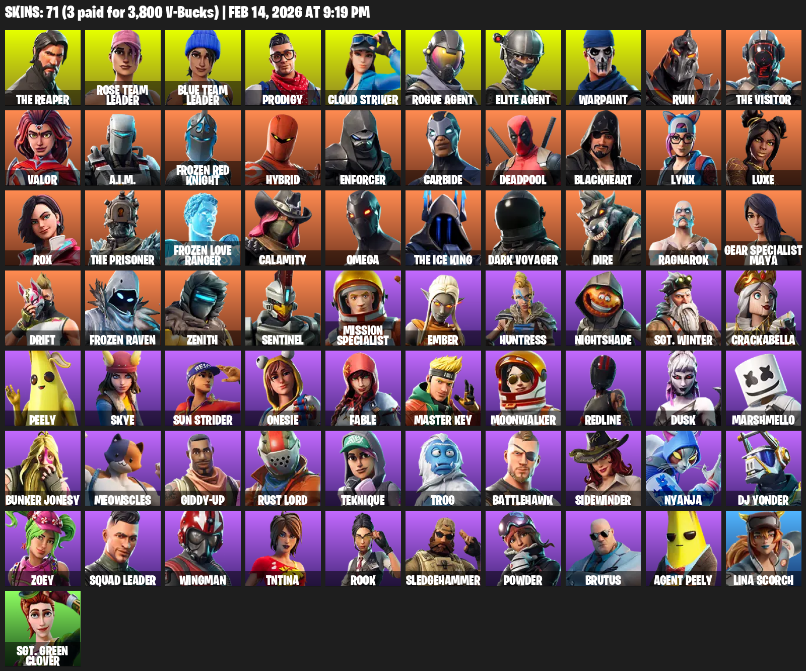 The Reaper, Elite Agent, Omega, Gear Specialist Maya, Rose Team Leader, Prodigy, Cloud Striker, Warpaint, Ruin, Valor, A.I.M., Frozen Red Knight, Hybrid, Enforcer, Carbide, Deadpool, Blackheart