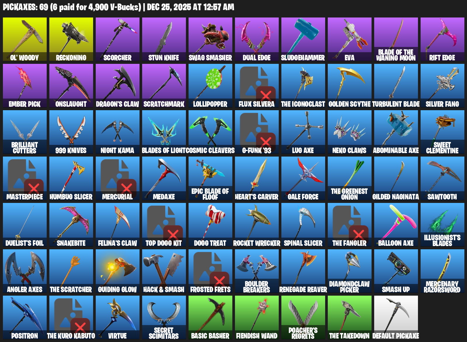 Ol’ Woody, Reckoning, Scorcher, Stun Knife, Swag Smasher, Dual Edge, Sludgehammer, EVA, Ember Pick, Onslaught, Dragon’s Claw, Scratchmark, Lollipopper, Flux Silvera, Golden Scythe, Turbulent Blade, Silver Fang