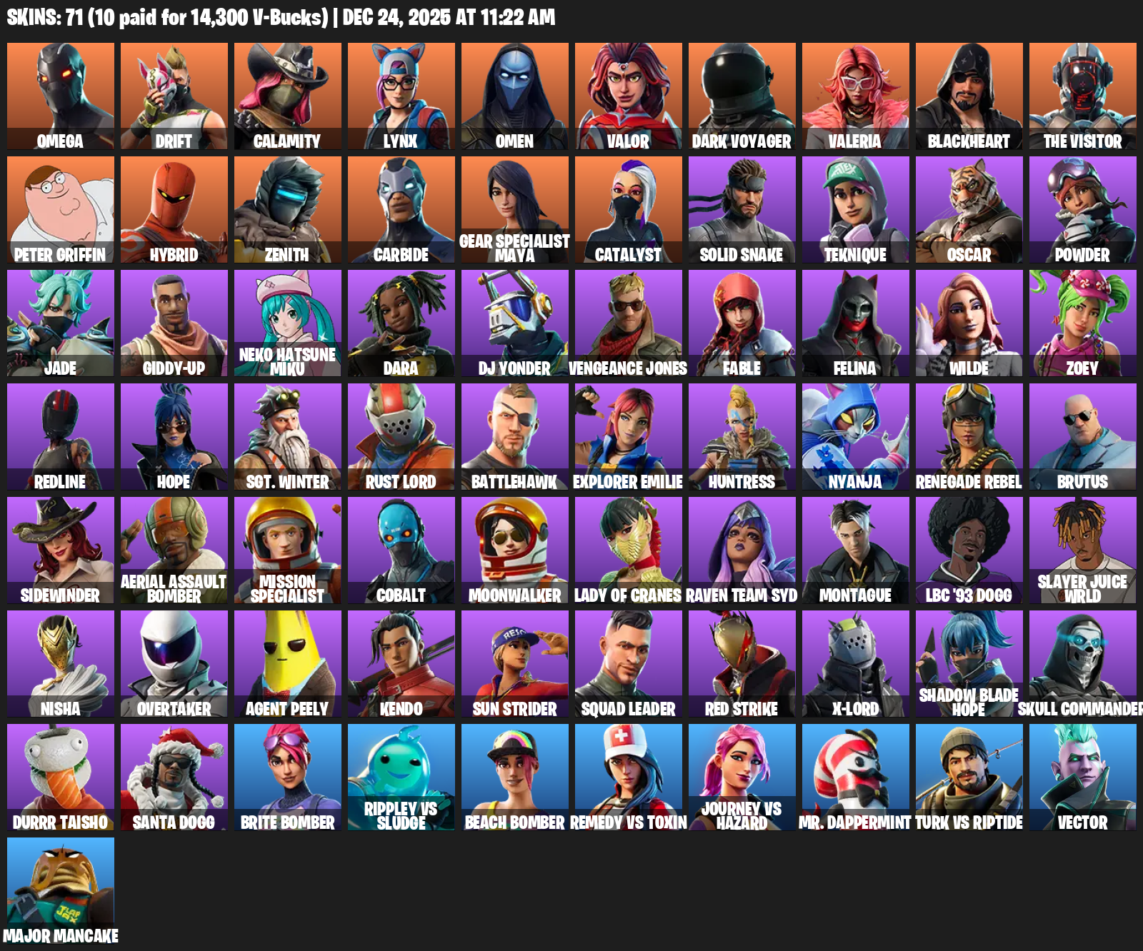 Omega, Gear Specialist Maya, Drift, Calamity, Lynx, Omen, Valor, Dark Voyager, Valeria, Blackheart, The Visitor, Peter Griffin, Hybrid, Zenith, Carbide, Catalyst, Solid Snake, Teknique, Oscar, Powder