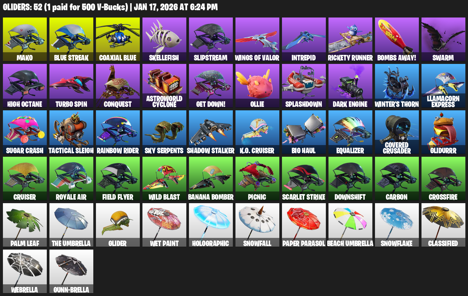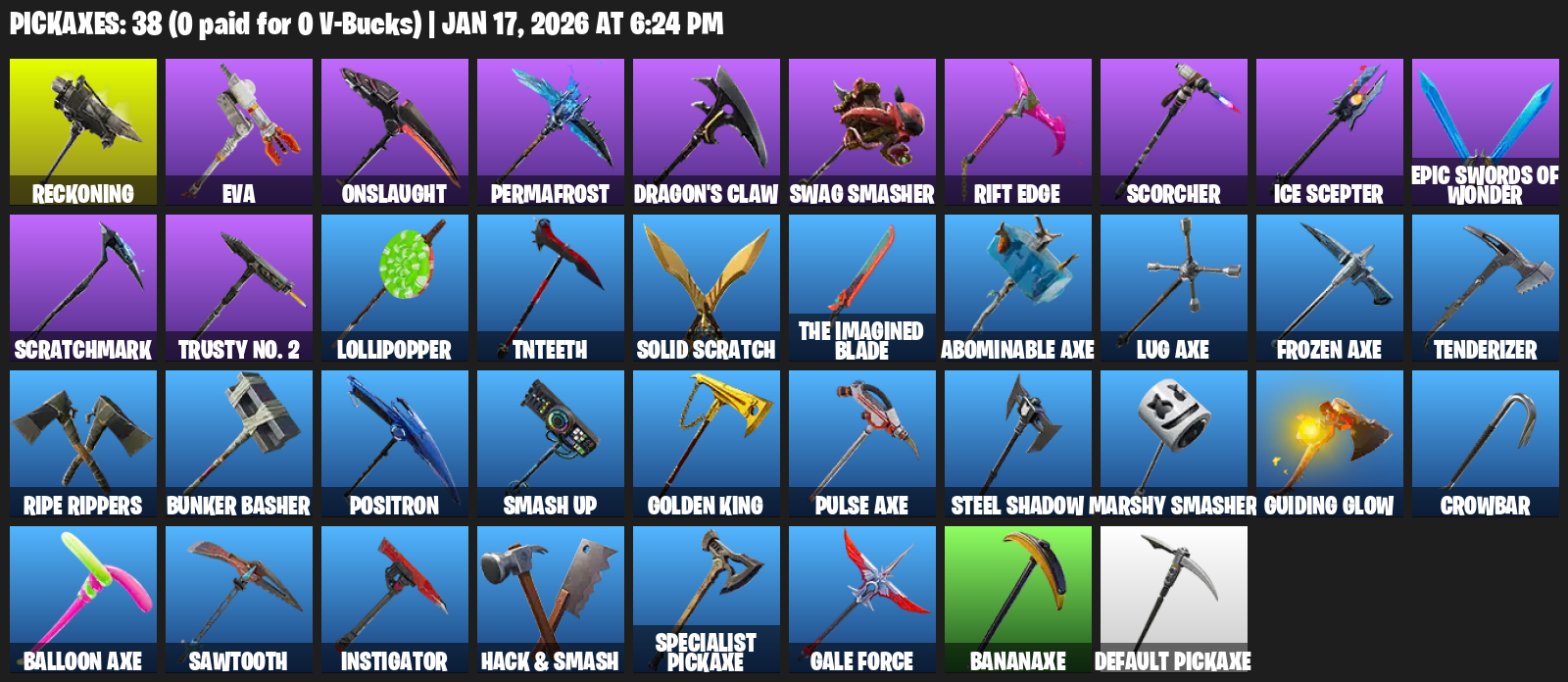 Reckoning, EVA, Onslaught, Permafrost, Dragon’s Claw, Swag Smasher, Rift Edge, Scorcher, Ice Scepter, Scratchmark, Trusty No. 2, Lollipopper, TNTeeth, Solid Scratch, Abominable Axe, Tenderizer