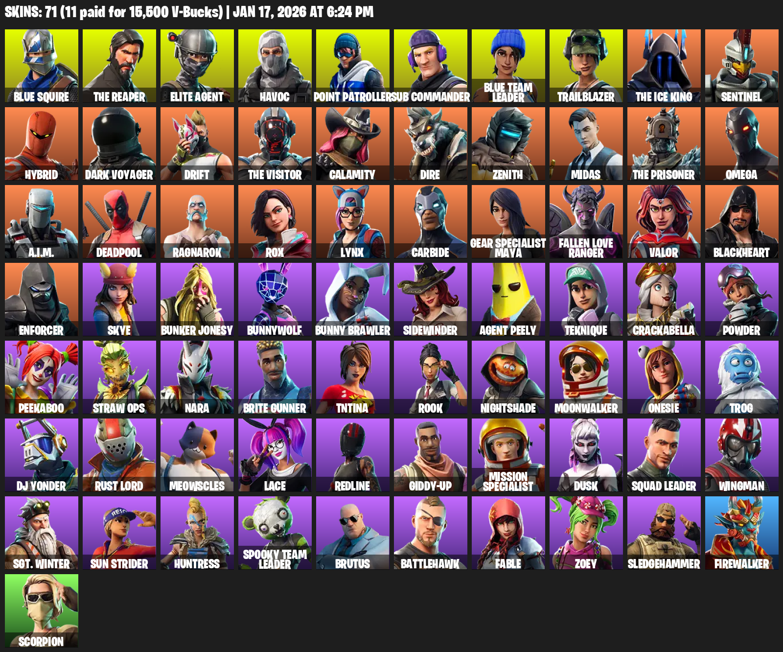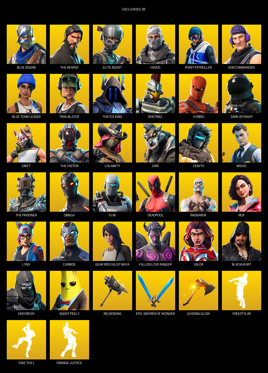 Blue Squire, The Reaper, Elite Agent, Point Patroller, Omega, Gear Specialist Maya, Havoc, Sub Commander, Trailblazer, Sentinel, Hybrid, Dark Voyager, Drift, Calamity, Dire, Zenith, Midas
