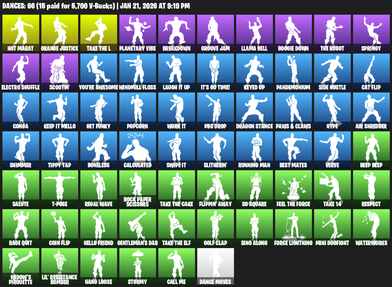 Hot Marat, Orange Justice, Planetary Vibe, Breakdown, Groove Jam, Llama Bell, Boogie Down, Springy, Electro Shuffle, Scootin’, You’re Awesome, Windmill Floss, It’s Go Time!, Pandemonium, Side Hustle, Cat Flip