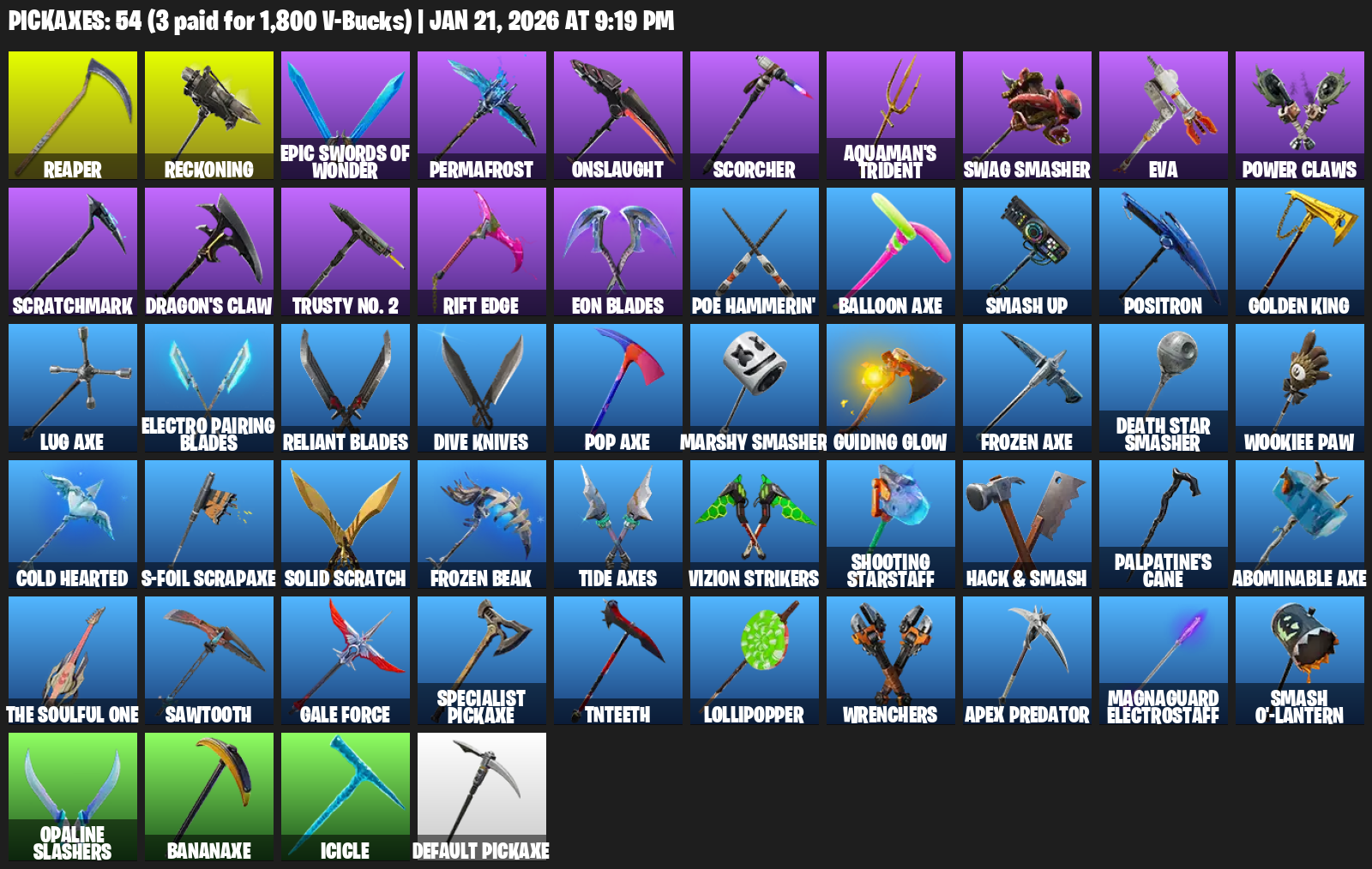 Reckoning, Permafrost, Onslaught, Scorcher, Aquaman’s Trident, Swag Smasher, EVA, Power Claws, Scratchmark, Dragon’s Claw, Trusty No. 2, Rift Edge, Eon Blades, Poe Hammerin’, Balloon Axe, Smash Up, Positron, Golden King