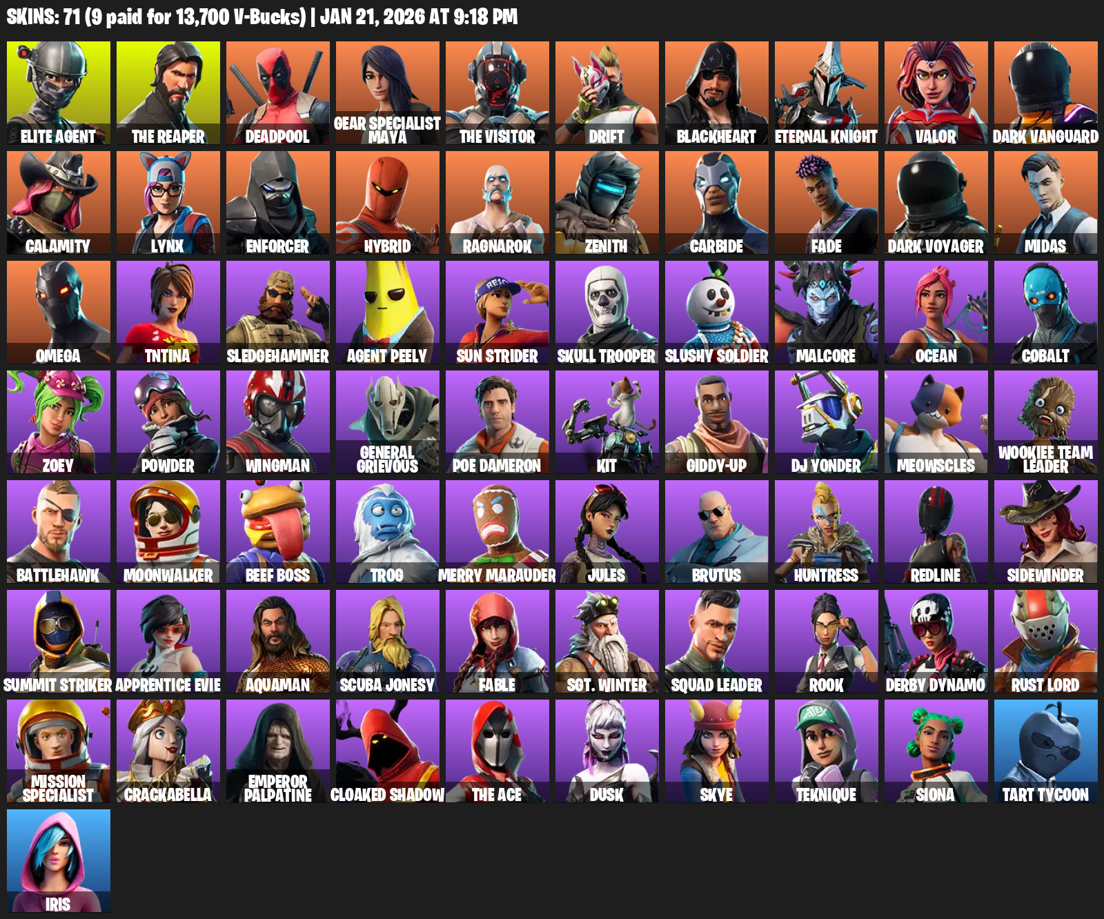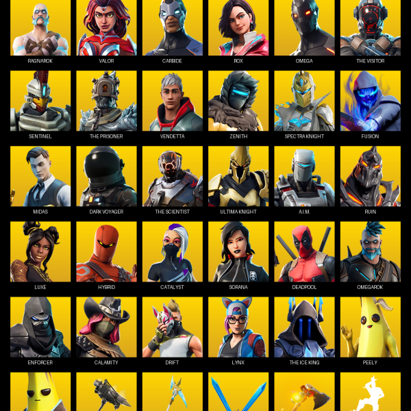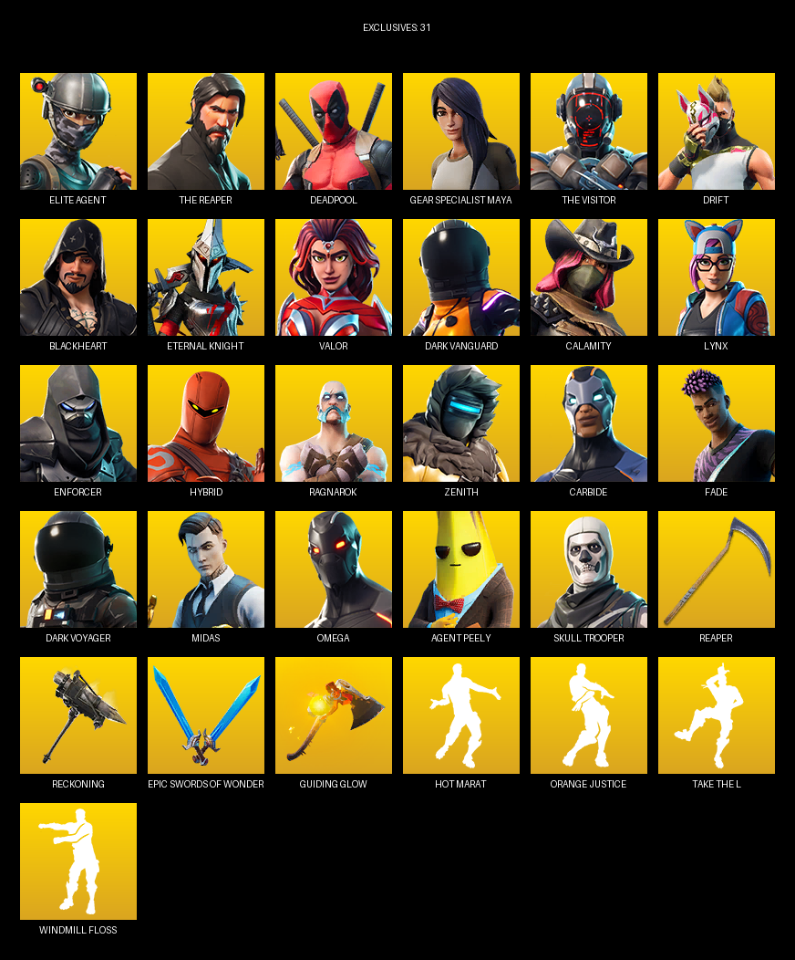 Elite Agent, The Reaper, Gear Specialist Maya, Omega, Deadpool, Drift, Blackheart, Eternal Knight, Valor, Dark Vanguard, Calamity, Lynx, Enforcer, Hybrid, Ragnarok, Zenith, Carbide, Fade