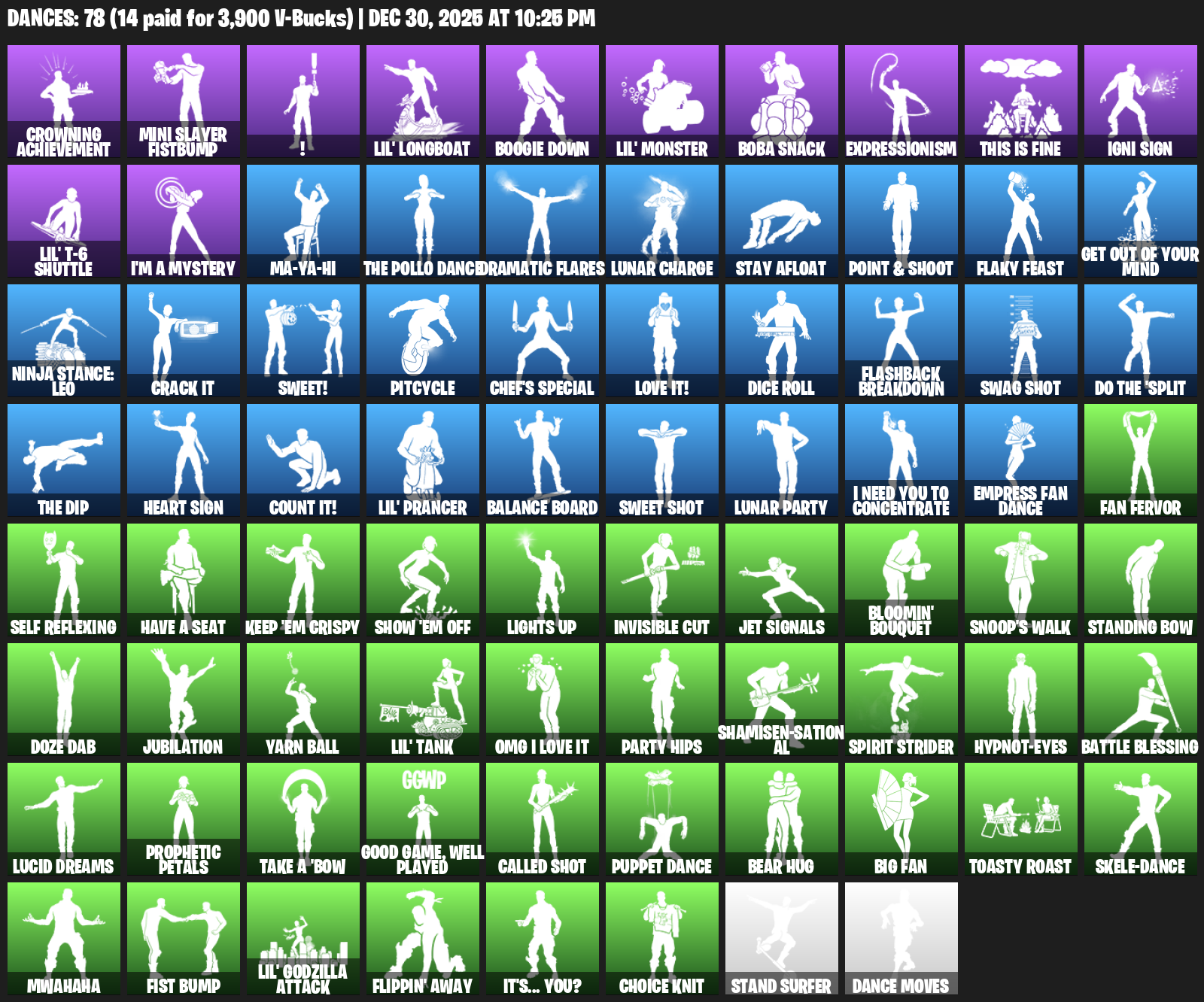 Crowning Achievement, Mini Slayer Fistbump, !, Lil’ Longboat, Boogie Down, Boba Snack, Expressionism, This is Fine, Igni Sign, I’m a Mystery, Ma-Ya-Hi, Dramatic Flares, Lunar Charge, Stay Afloat, Point & Shoot, Flaky Feast