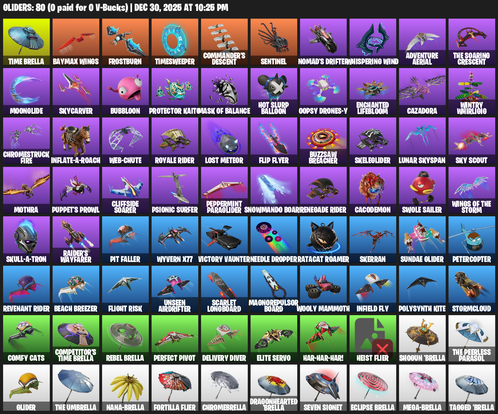 Time Brella, Baymax Wings, Frostburn, Timesweeper, Commander’s Descent, Sentinel, Nomad’s Drifter, Whispering Wind, Adventure Aerial, Moonglide, Skycarver, Bubbloon, Protector Kaito, Hot Slurp Balloon, Oopsy Drones-y, Enchanted Lifebloom, Cazadora, Wintry Whirligig