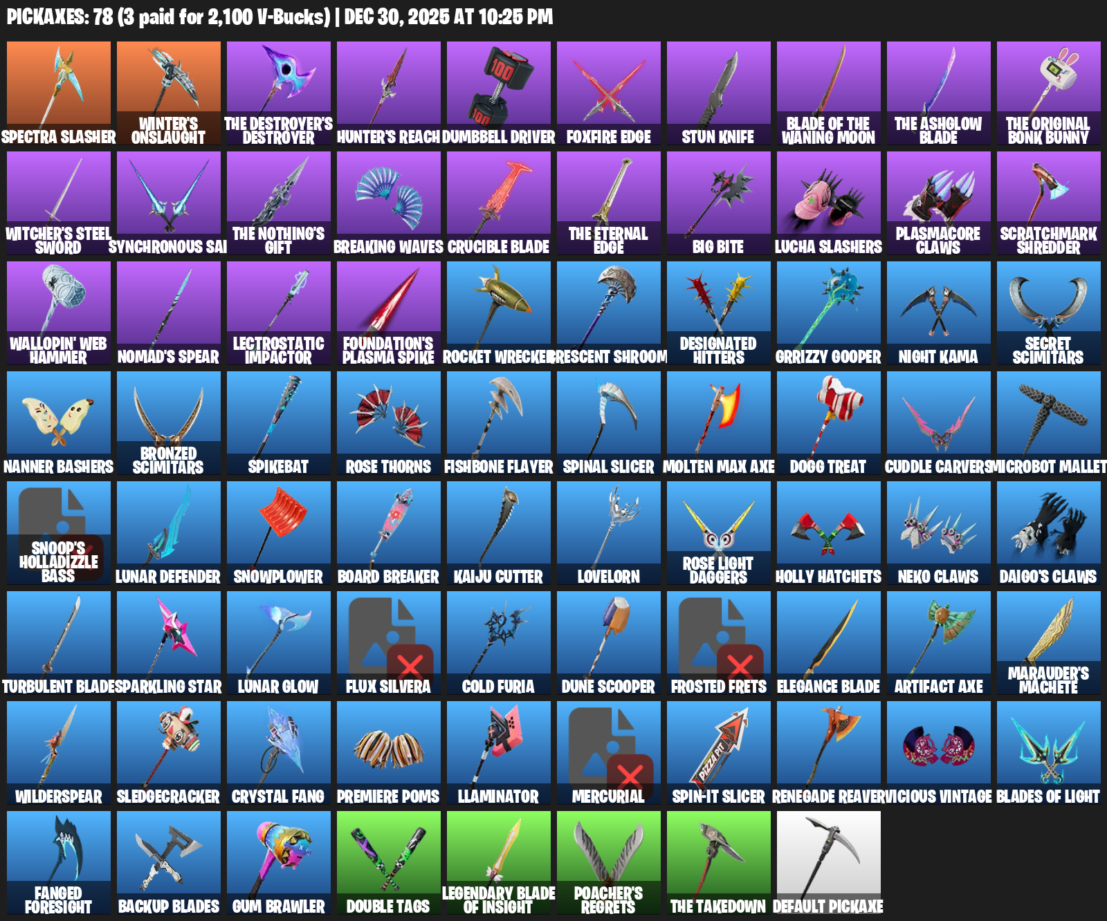 Winter’s Onslaught, Hunter’s Reach, Dumbbell Driver, Foxfire Edge, Stun Knife, Witcher’s Steel Sword, Synchronous Sai, Breaking Waves, Big Bite, Lucha Slashers, Plasmacore Claws, Scratchmark Shredder