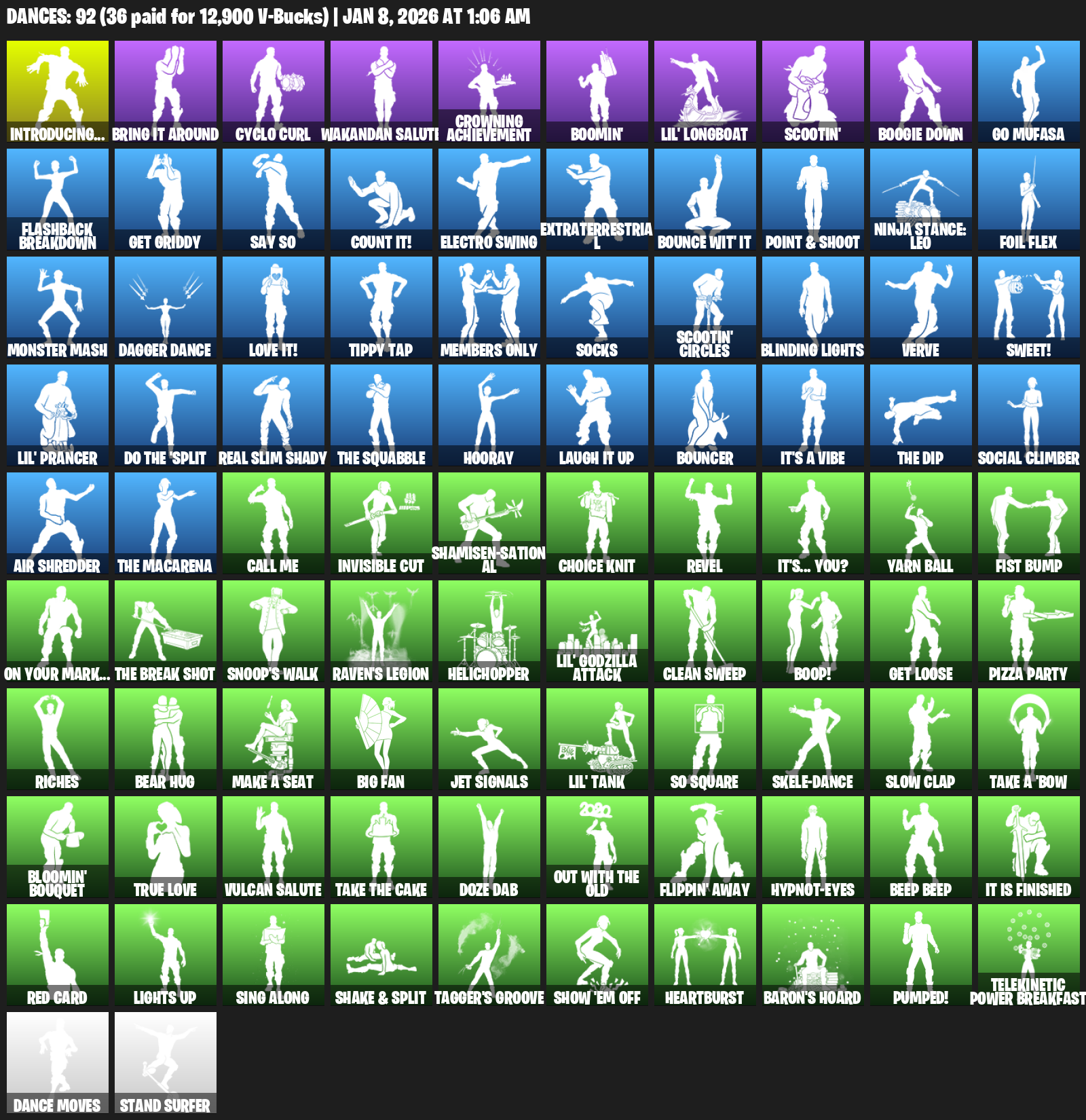 Introducing…, Bring it around, Cyclo Curl, Wakandan Salute, Crowning Achievement, Boomin’, Lil’ Longboat, Scootin’, Boogie Down, Go Mufasa, Flashback Breakdown, Get Griddy, Say So, Count It!, Electro Swing, Extraterrestrial, Ninja Stance: Leo, Foil Flex