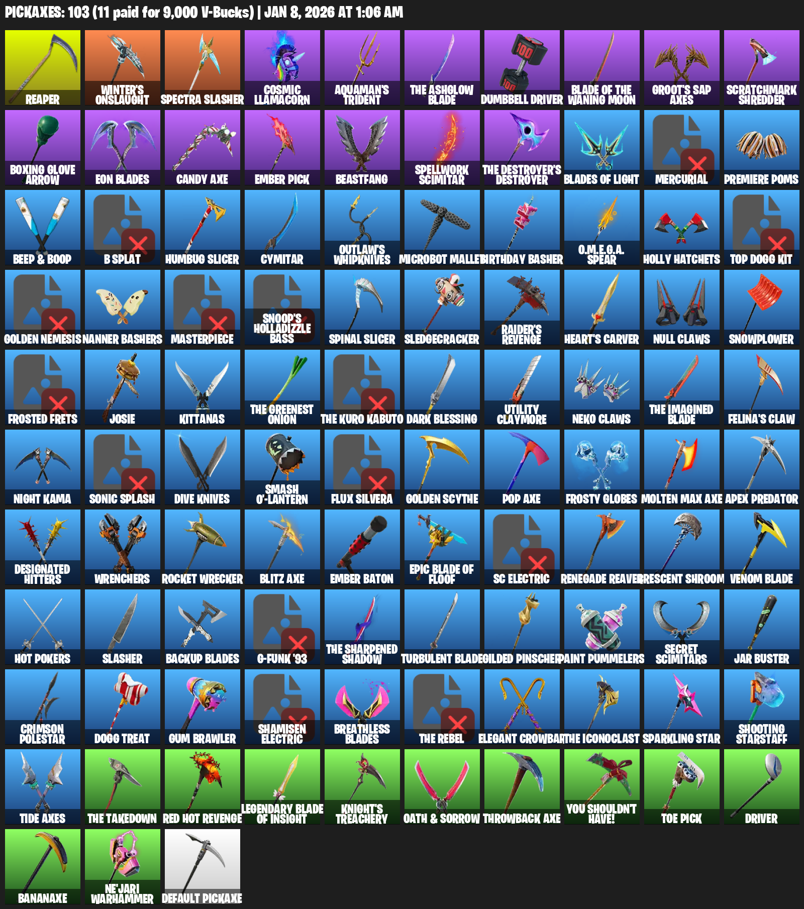 Raider’s Revenge, Reaper, Winter’s Onslaught, Cosmic Llamacorn, Aquaman’s Trident, The Ashglow Blade, Dumbbell Driver, Groot’s Sap Axes, Scratchmark Shredder, Boxing Glove Arrow, Eon Blades, Candy Axe, Ember Pick, Beastfang, Spellwork Scimitar, Mercurial