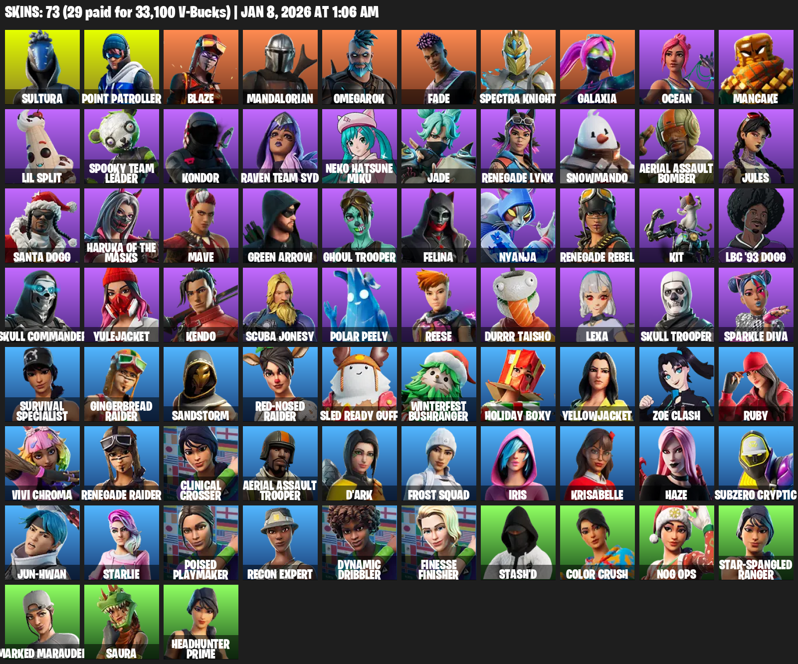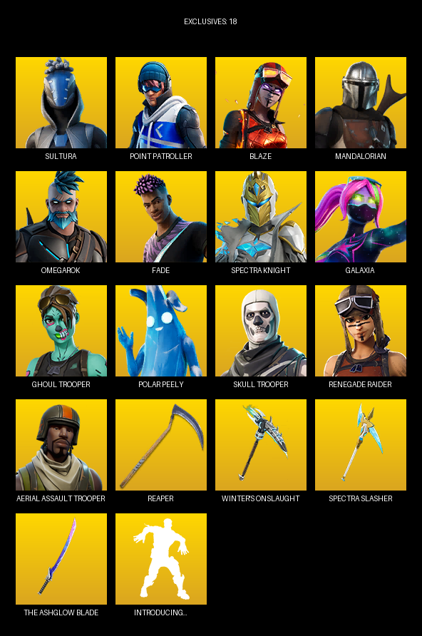 Point Patroller, Renegade Raider, Aerial Assault Trooper, Sultura, Blaze, Mandalorian, Omegarok, Fade, Spectra Knight, Galaxia, Ocean, Mancake, Lil Split, Spooky Team Leader, Kondor, Neko Hatsune Miku, Jade, Snowmando