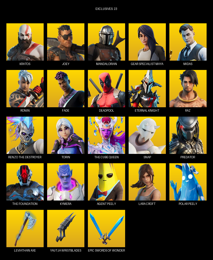 Gear Specialist Maya, Lara Croft, Kratos, Joey, Mandalorian, Midas, Ronin, Fade, Deadpool, Eternal Knight, Raz, Renzo the Destroyer, Torin, Snap, Predator, Kymera, Cluck, Agent Peely