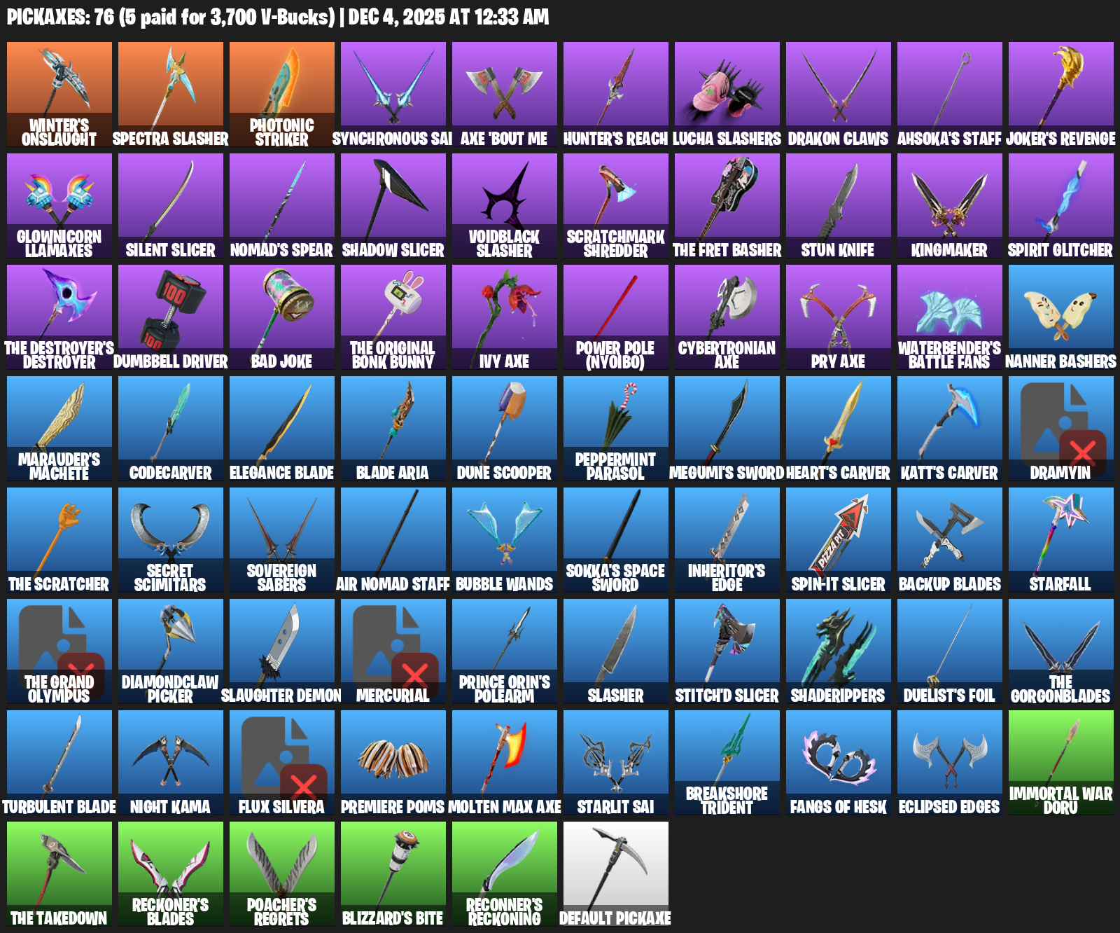 Winter’s Onslaught, Photonic Striker, Synchronous Sai, Axe ‘Bout Me, Hunter’s Reach, Lucha Slashers, Drakon Claws, Ahsoka’s Staff, Joker’s Revenge, Glownicorn Llamaxes, Silent Slicer, Nomad’s Spear, Voidblack Slasher, Scratchmark Shredder, Stun Knife, Kingmaker, Spirit Glitcher