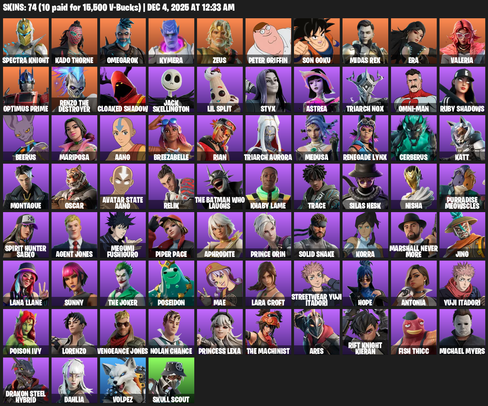 [PC/PSN/XBOX] | 74 skins | 900 V-bucks | Lara Croft | Spectra Knight | Kado Thorne | Omegarok | Kymera | Zeus | Peter Griffin | Son Goku | #DMQ0997