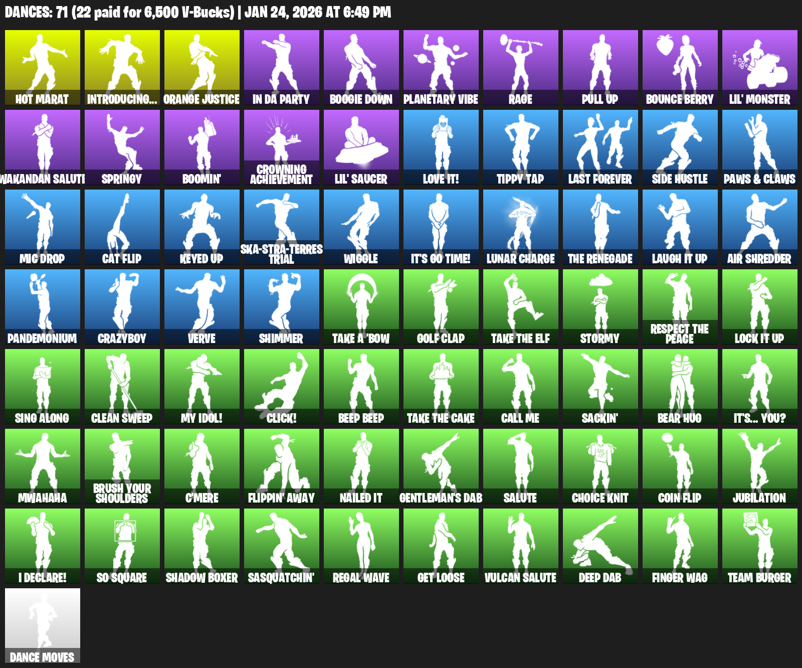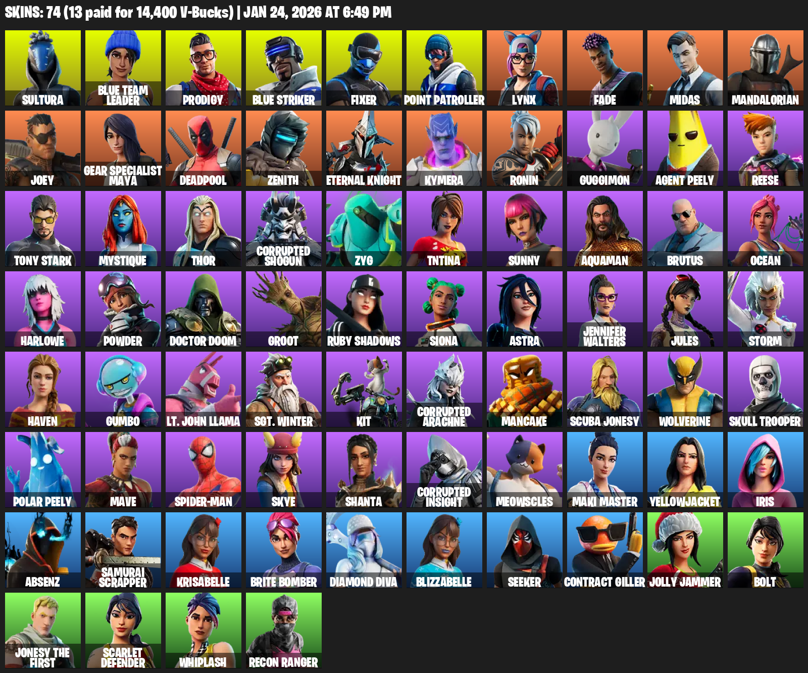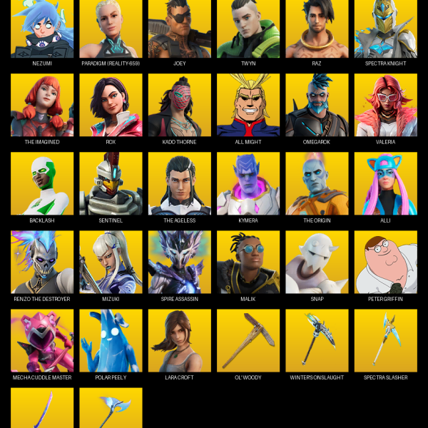 Point Patroller, Gear Specialist Maya, Sultura, Blue Team Leader, Prodigy, Fixer, Lynx, Fade, Midas, Mandalorian, Joey, Deadpool, Zenith, Eternal Knight, Kymera, Ronin, Guggimon, Agent Peely, Reese