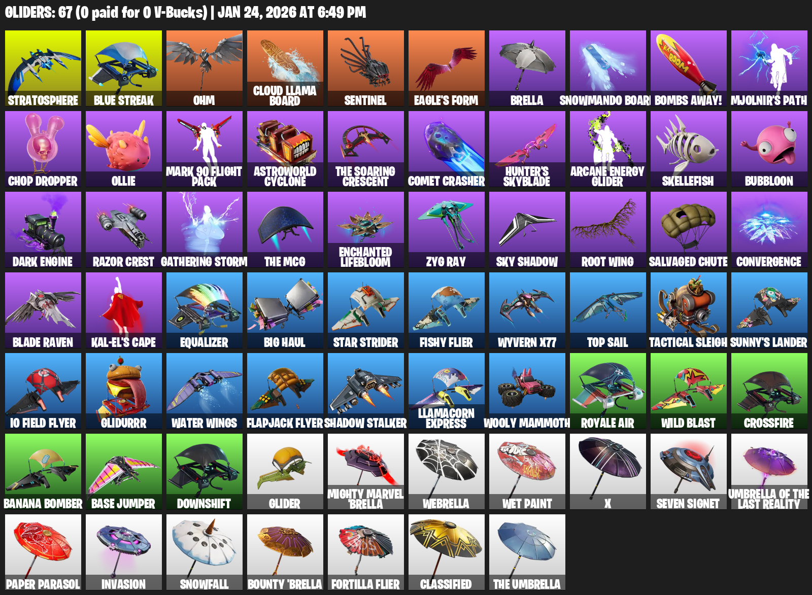 Stratosphere, Ohm, Cloud Llama Board, Sentinel, Eagle’s Form, Brella, Bombs Away!, Mjolnir’s Path, Chop Dropper, Ollie, Astroworld Cyclone, Comet Crasher, Hunter’s Skyblade, Skellefish, Bubbloon