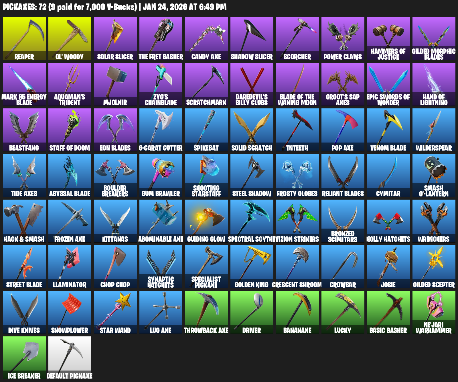 Reaper, Ol’ Woody, Solar Slicer, The Fret Basher, Candy Axe, Scorcher, Power Claws, Hammers of Justice, Gilded Morphic Blades, Mark 85 Energy Blade, Aquaman’s Trident, Mjolnir, Zyg’s Chainblade, Scratchmark, Daredevil’s Billy Clubs, Groot’s Sap Axes