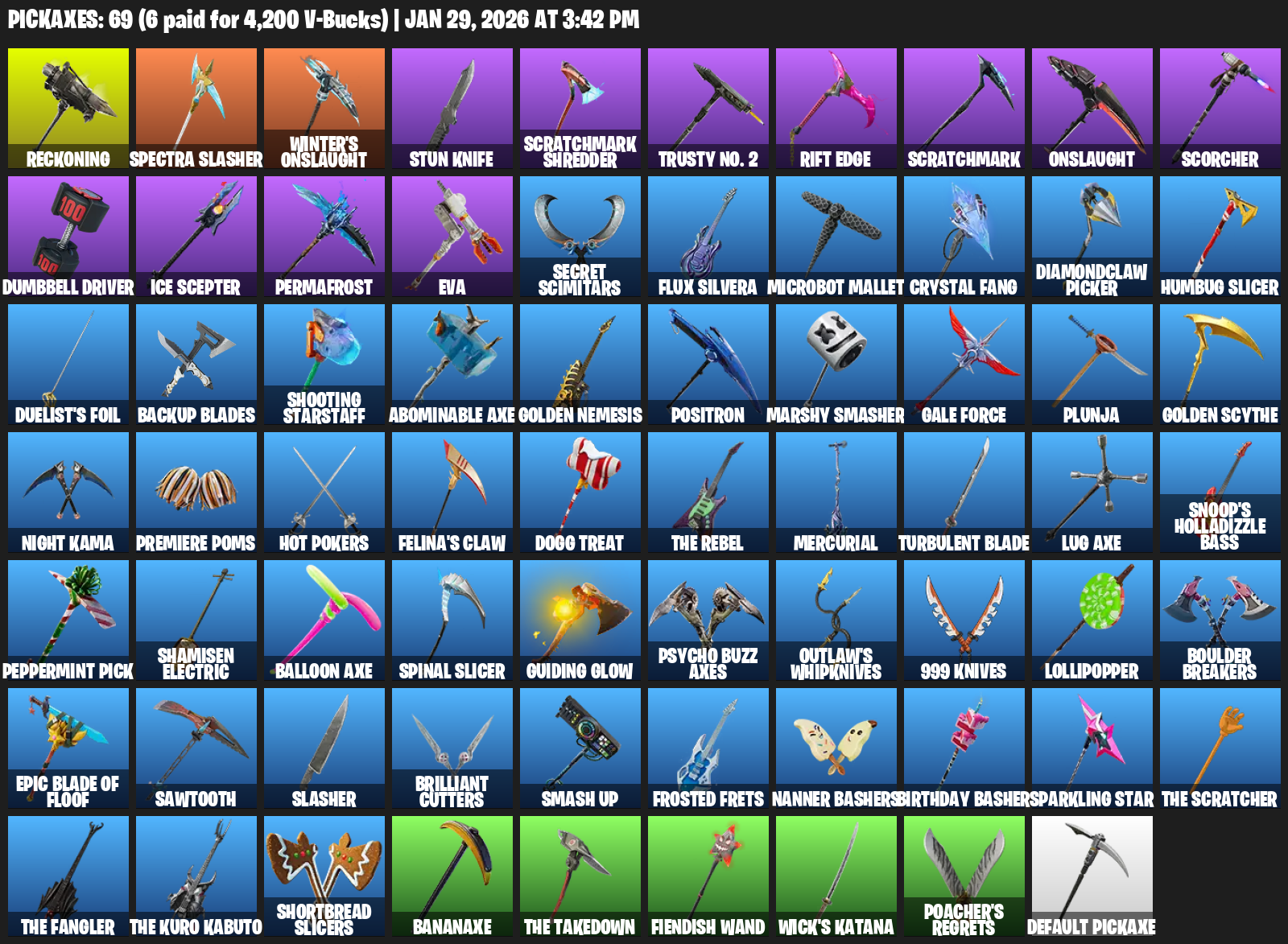 Reckoning, Spectra Slasher, Winter’s Onslaught, Stun Knife, Scratchmark Shredder, Trusty No. 2, Rift Edge, Scorcher, Dumbbell Driver, Ice Scepter, Permafrost, EVA, Secret Scimitars, Flux Silvera, Microbot Mallet, Crystal Fang, Diamondclaw Picker, Humbug Slicer