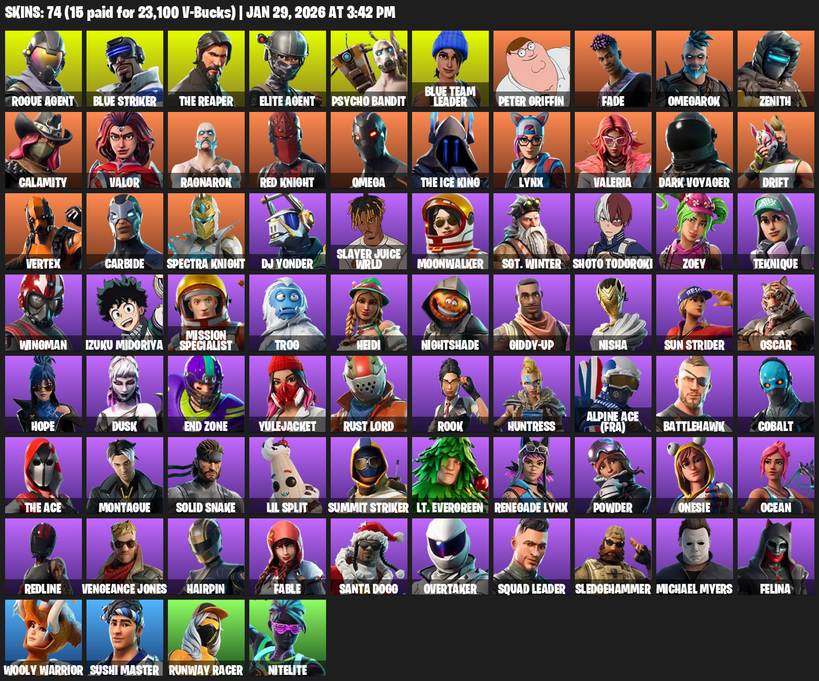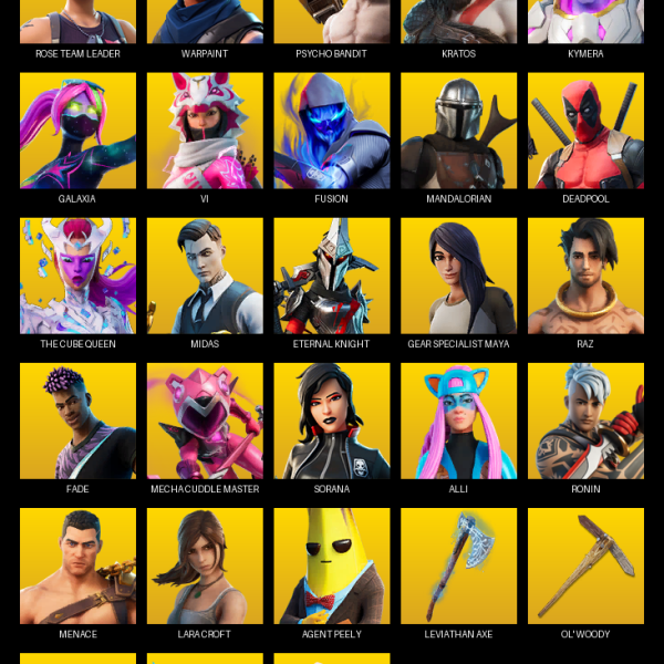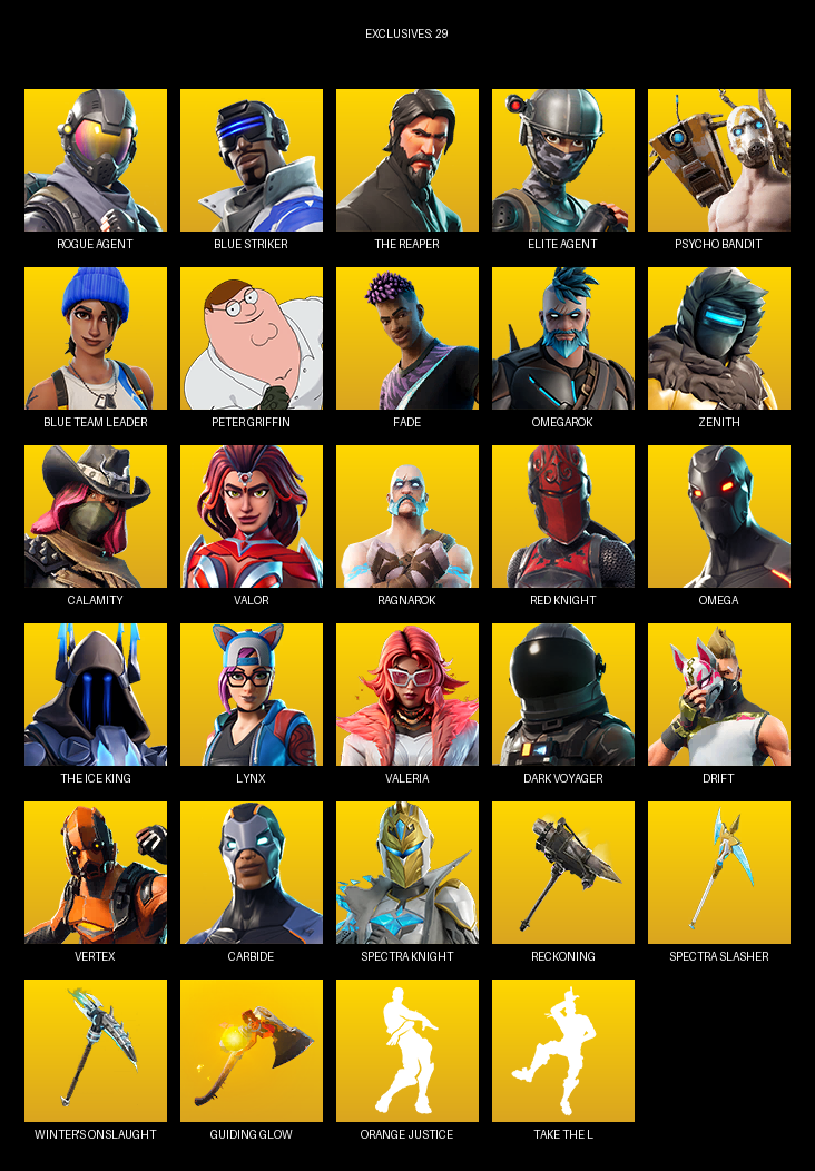 The Reaper, Elite Agent, Omega, Blue Striker, Psycho Bandit, Peter Griffin, Fade, Omegarok, Zenith, Calamity, Valor, Ragnarok, Red Knight, Lynx, Valeria, Dark Voyager, Drift