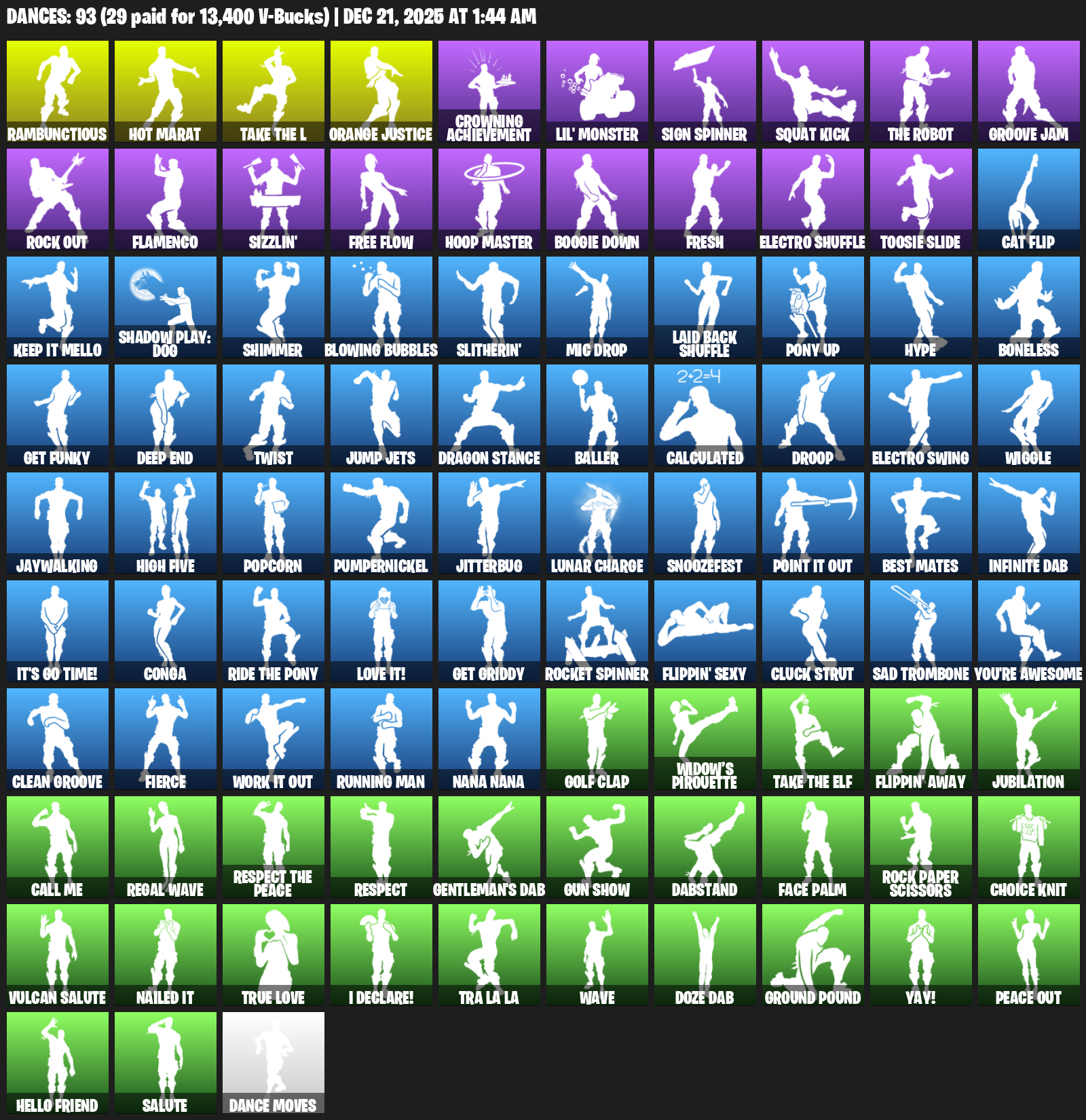 Hot Marat, Rambunctious, Orange Justice, Crowning Achievement, Lil’ Monster, Sign Spinner, Squat Kick, Groove Jam, Rock Out, Flamenco, Sizzlin’, Free Flow, Hoop Master, Boogie Down, Fresh, Electro Shuffle, Toosie Slide, Cat Flip