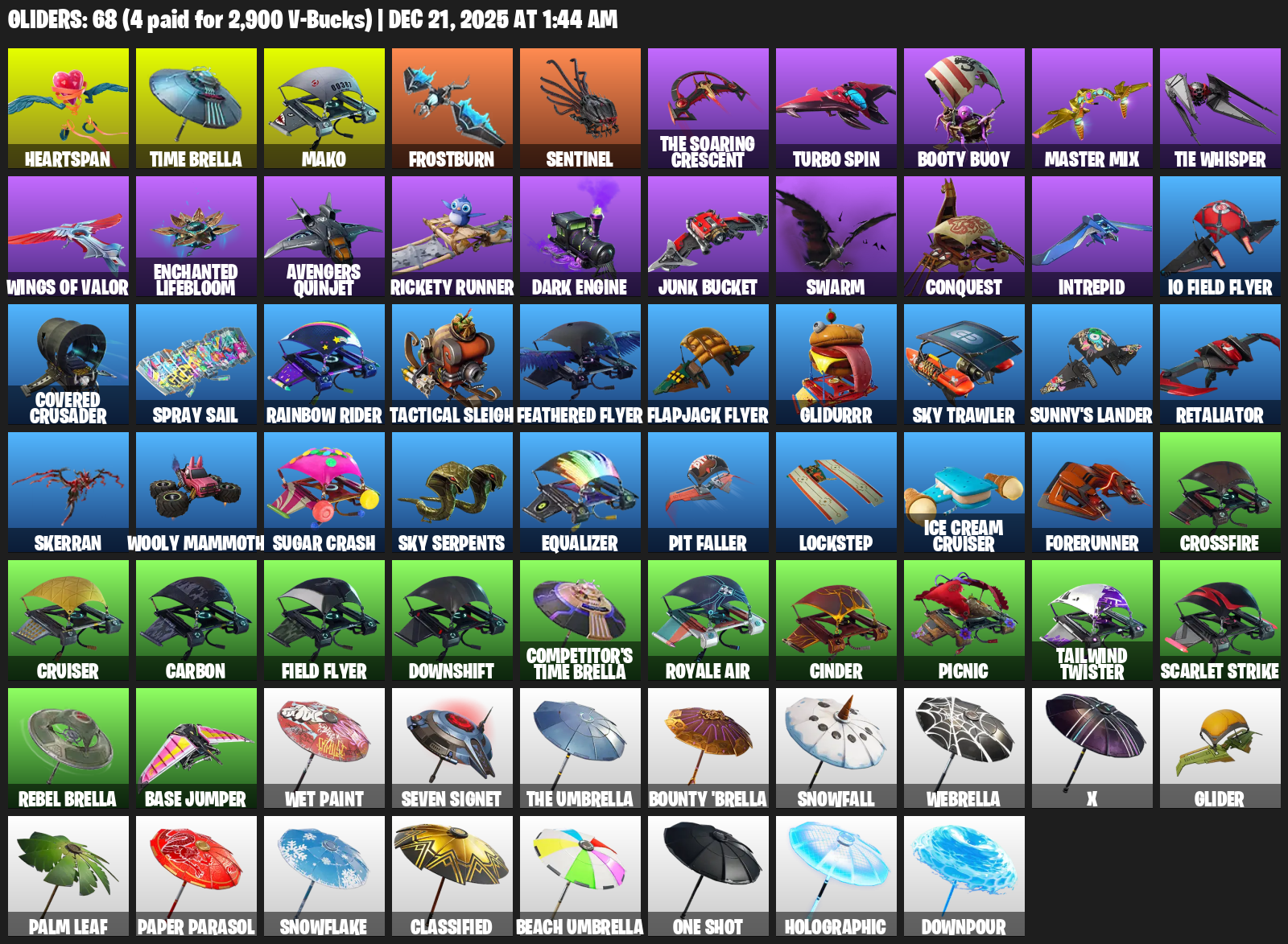 Mako, Heartspan, Time Brella, Frostburn, Turbo Spin, Booty Buoy, TIE Whisper, Enchanted Lifebloom, Avengers Quinjet, Rickety Runner, Dark Engine, Junk Bucket, Swarm, Conquest, Intrepid, IO Field Flyer