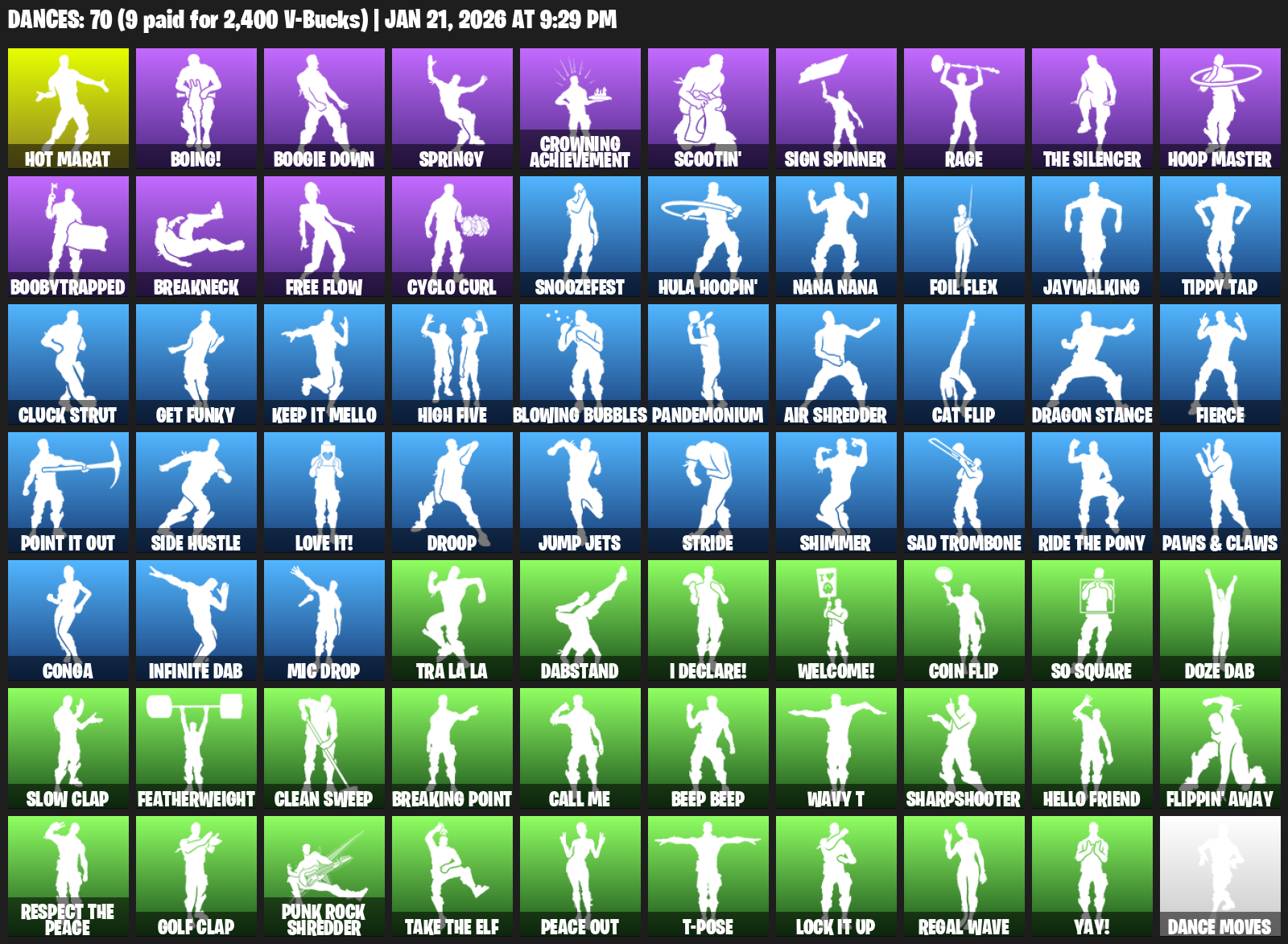 Hot Marat, Boing!, Boogie Down, Springy, Crowning Achievement, Scootin’, Sign Spinner, Rage, Hoop Master, Boobytrapped, Breakneck, Free Flow, Cyclo Curl, Snoozefest, Hula Hoopin’, Nana Nana, Foil Flex, Jaywalking, Tippy Tap