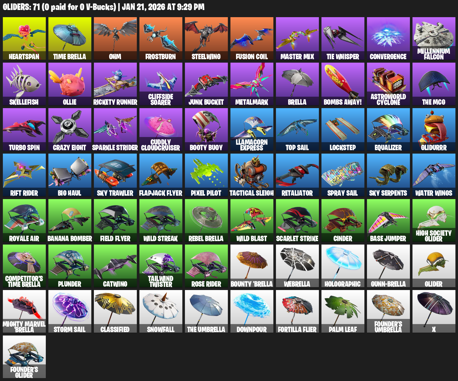 Heartspan, Time Brella, Ohm, Frostburn, Steelwing, TIE Whisper, Convergence, Millennium Falcon, Skellefish, Ollie, Rickety Runner, Cliffside Soarer, Junk Bucket, Metalmark, Bombs Away!, Astroworld Cyclone
